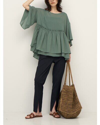 ボリューム感のあるトップスやチュニック、ワンピースのレイヤードなどにも活躍できる、オールシーズ着まわせるボトムになっています。