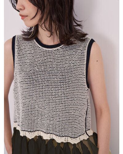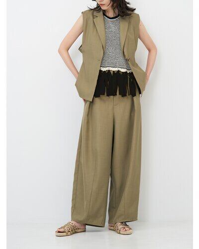 ノースリーブ仕様ですっきりとした印象に仕上げつつ、異素材使いで華やかさをプラス。