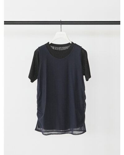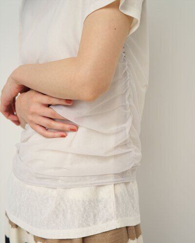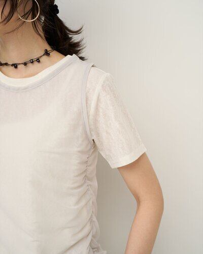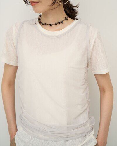 サイドにギャザーを施したチュール素材のタンクトップをレイヤードしたトップス。