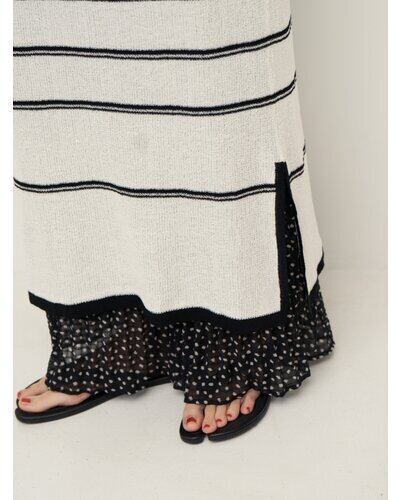 ボーダーのピッチを少しずつ変化させ、上半身はすっきりと、裾回りは大胆にみえるようにオリジナルでボーダーを組んでいます。2×1のリブ組織なので、体のラインを拾いすぎずにスッキリとしたシルエットになっています。