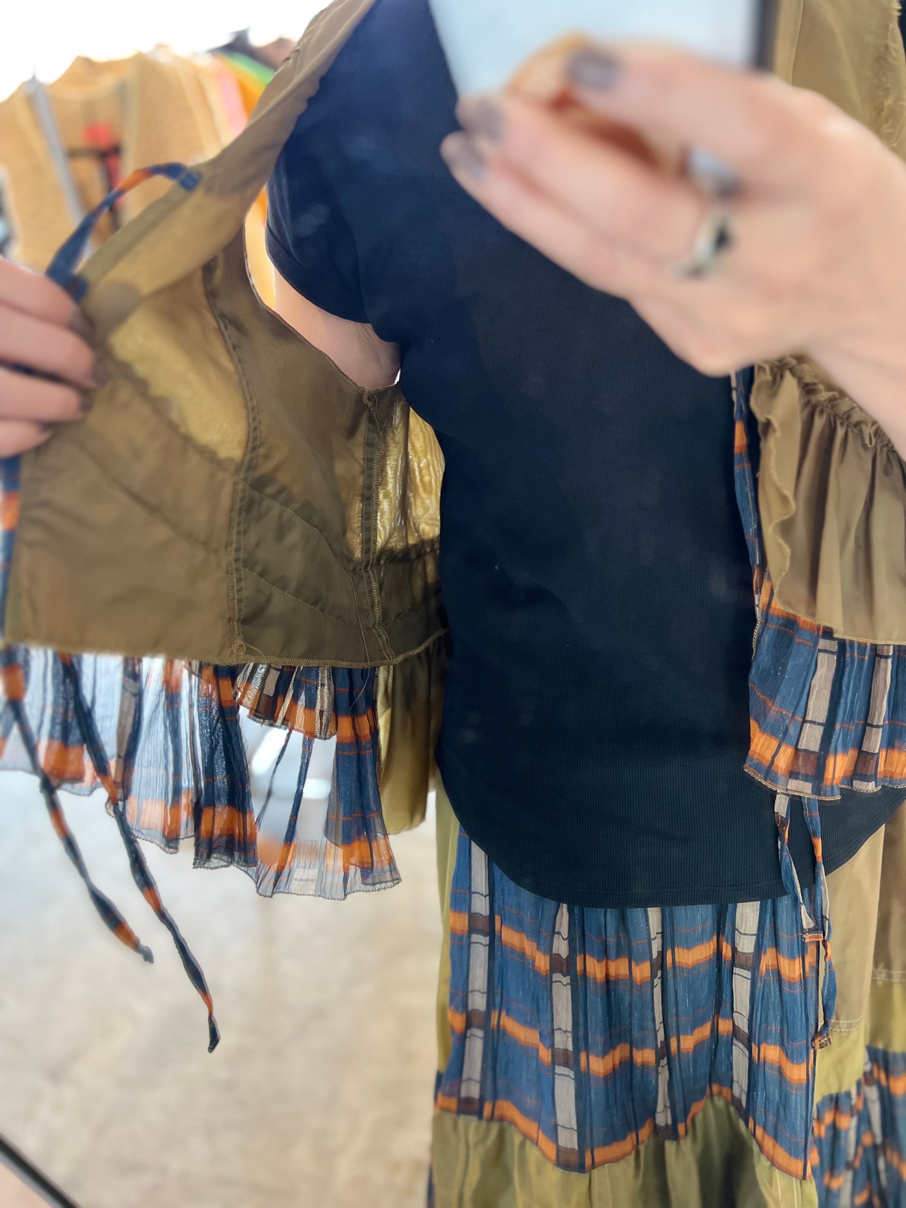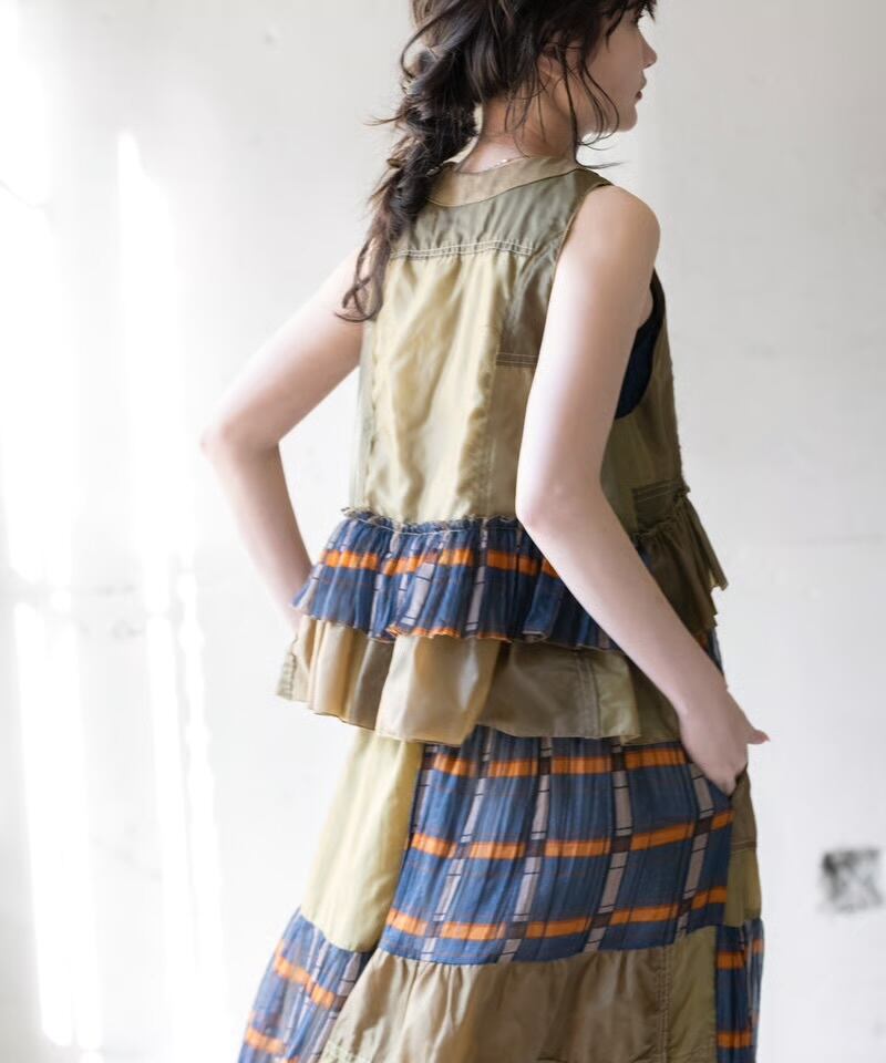 フランス軍のパラシュートを解体し、女性らしさ際立つフリルベストに仕立てました。