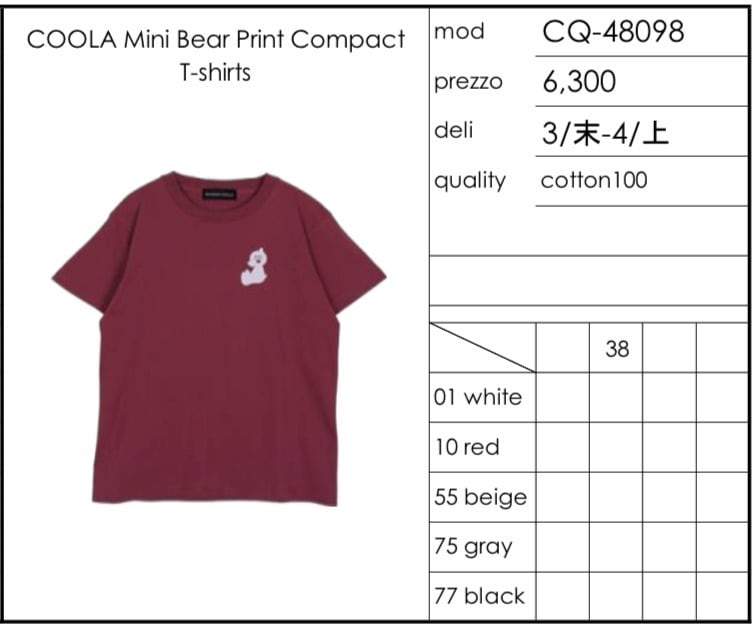 予約販売【 COOLA 】CQ-48098 COOLA Mini Bear Print Compact T-shirts 4月入荷お届け