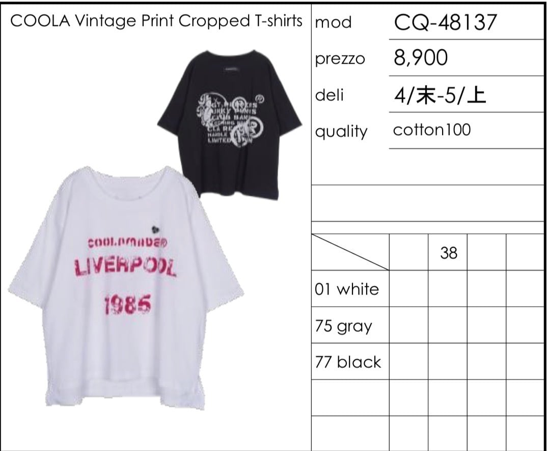 予約販売【 COOLA 】CQ-48137 COOLA Vintage Print Cropped T-shirts 5月入荷お届け