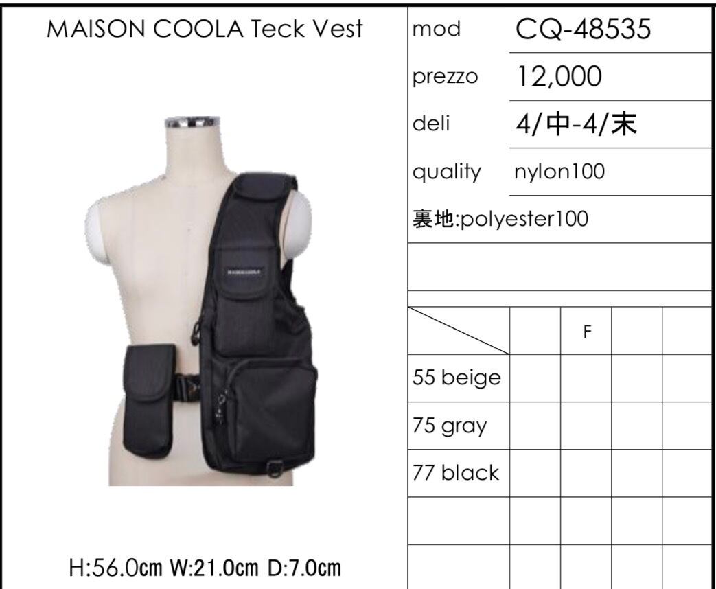 予約販売【 COOLA 】CQ-48535 MAISON COOLA Teck Vest 4月入荷お届け