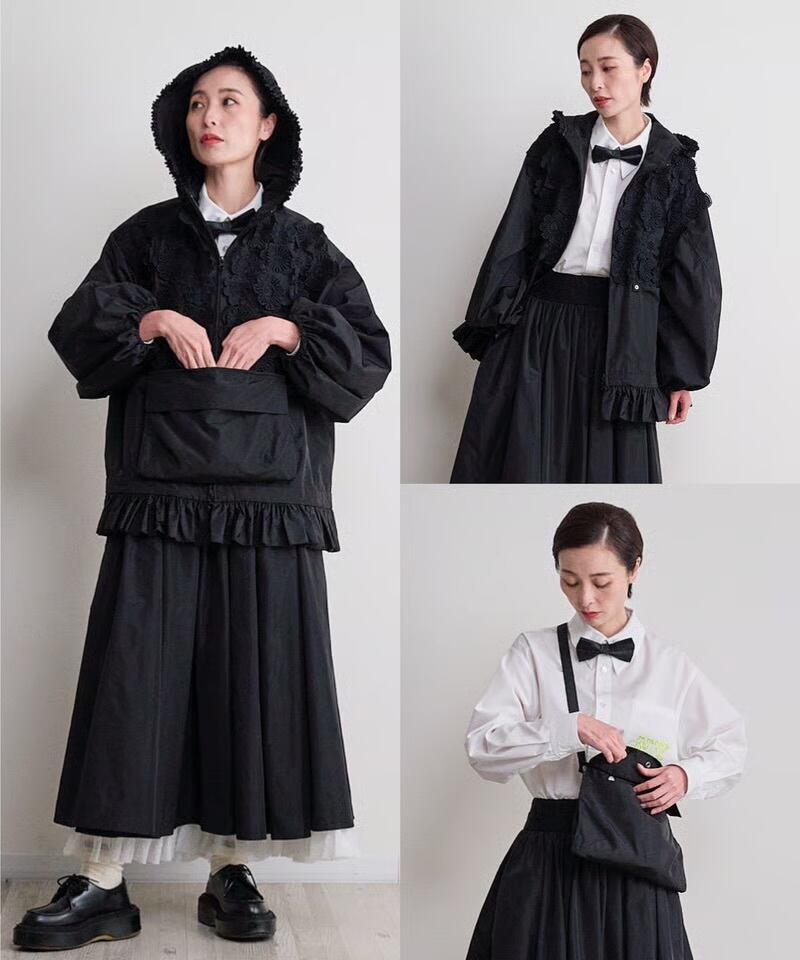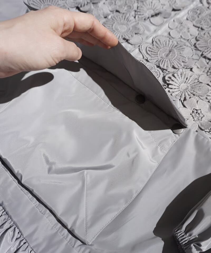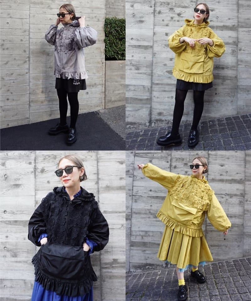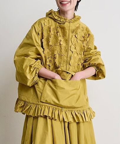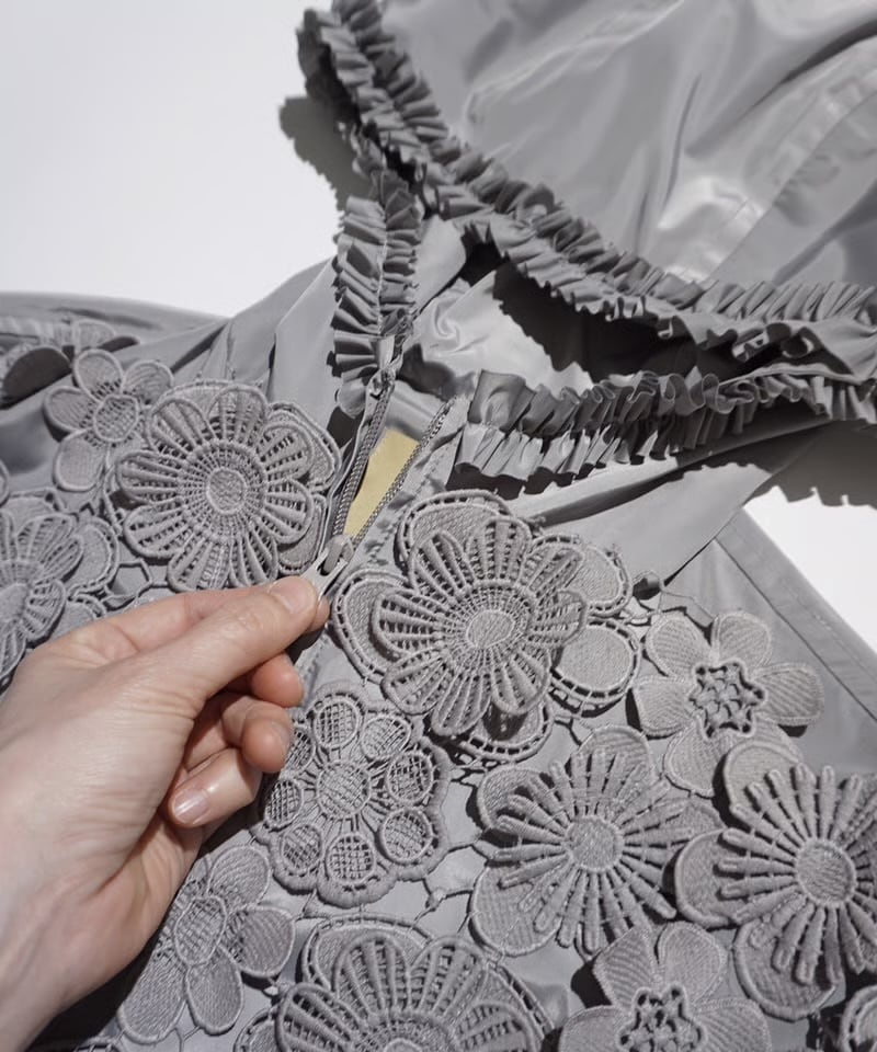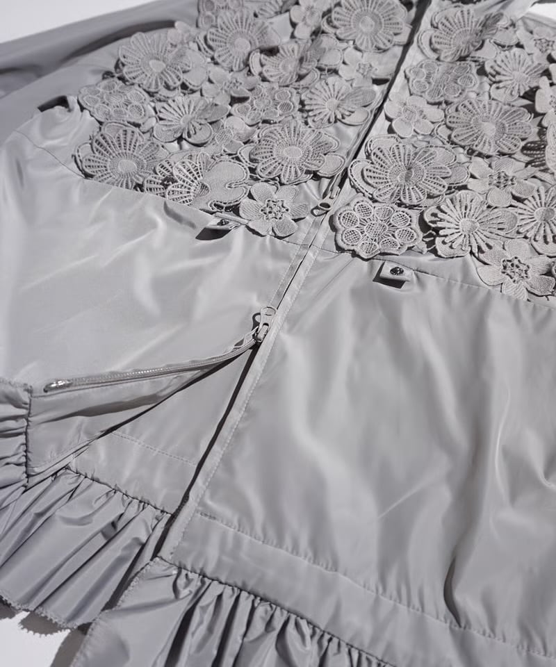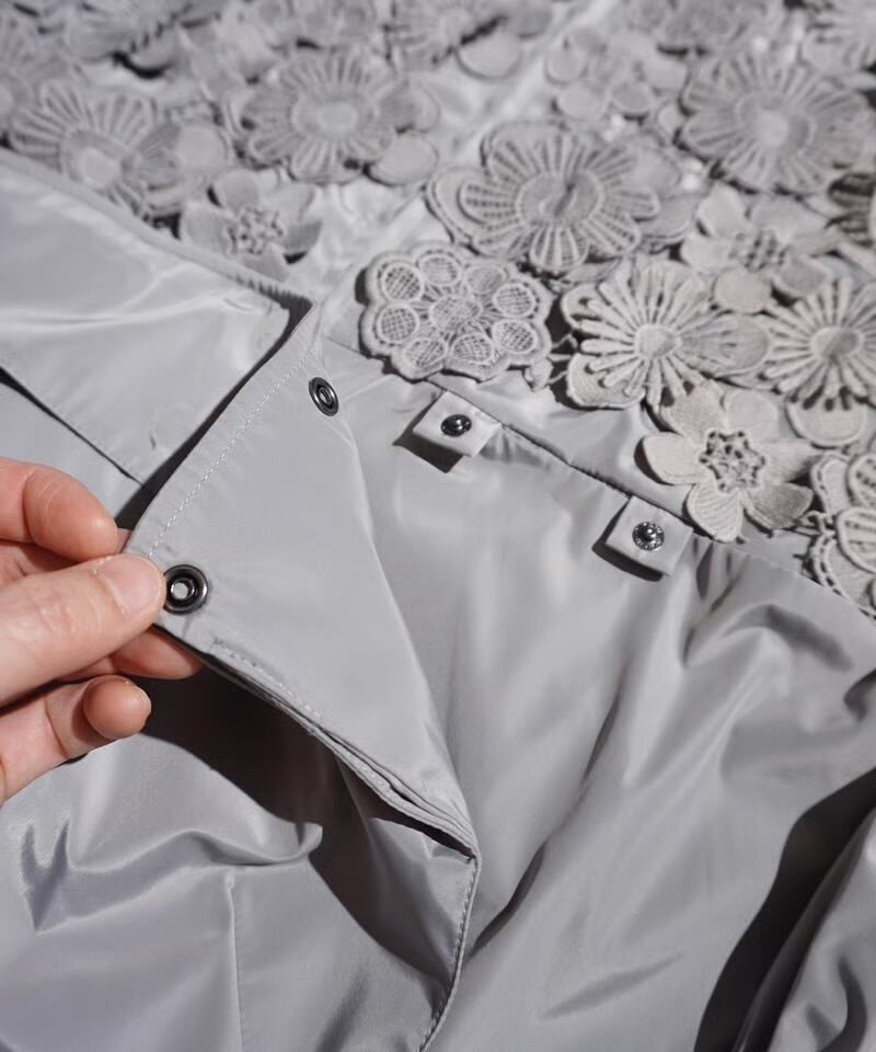 新型のタフタのアノラック型ブルゾンです。アノラックは通常、プルオーバーでフロントジップが全開にならないタイプが主流ですが、女子にはメイクが服に付く恐れがありあまり向かない。でもフロントのカンガルーポケットは付けたい、と考え、工夫を凝らしました。ドットボタンでフロントのカンガルーポケットが取り外し可能で外すと、ジップ開閉ができるというもの。フロントのフラワーレースはこれでもかと言うほど装飾しました。フロントに立体的な装飾が欲しくてレースを叩きつけています。試験的に作ってみたけれど、取り外しが出来て前が全開になるのはとても着やすい。フロントポケットは外したままでもドットボタンは見えないようにポケットに隠れる仕組みにしました。試行錯誤で出来上がったデザインです。カンガルーポケットはカジュアルに見える為、外したままで着用も良いかと思います。レディライクなフラワーレースと、アノラックのメンズライクな雰囲気のコンビネーションが新鮮に感じます。レースは染めを施し、本体生地と同色で仕上げています。