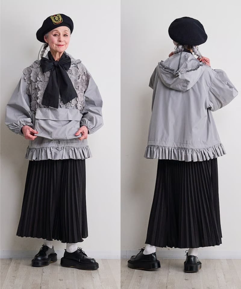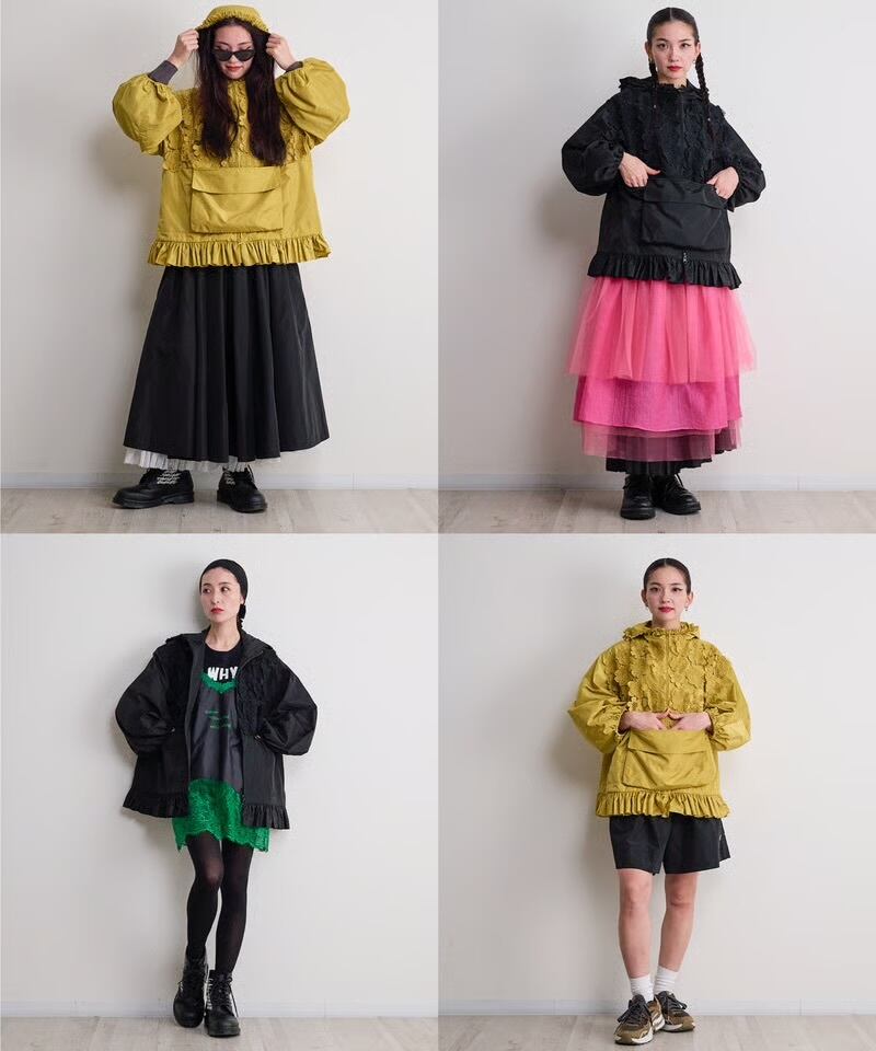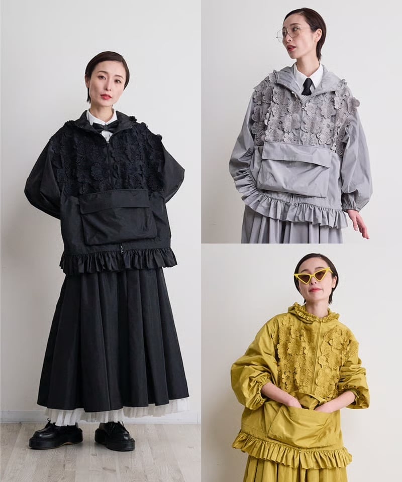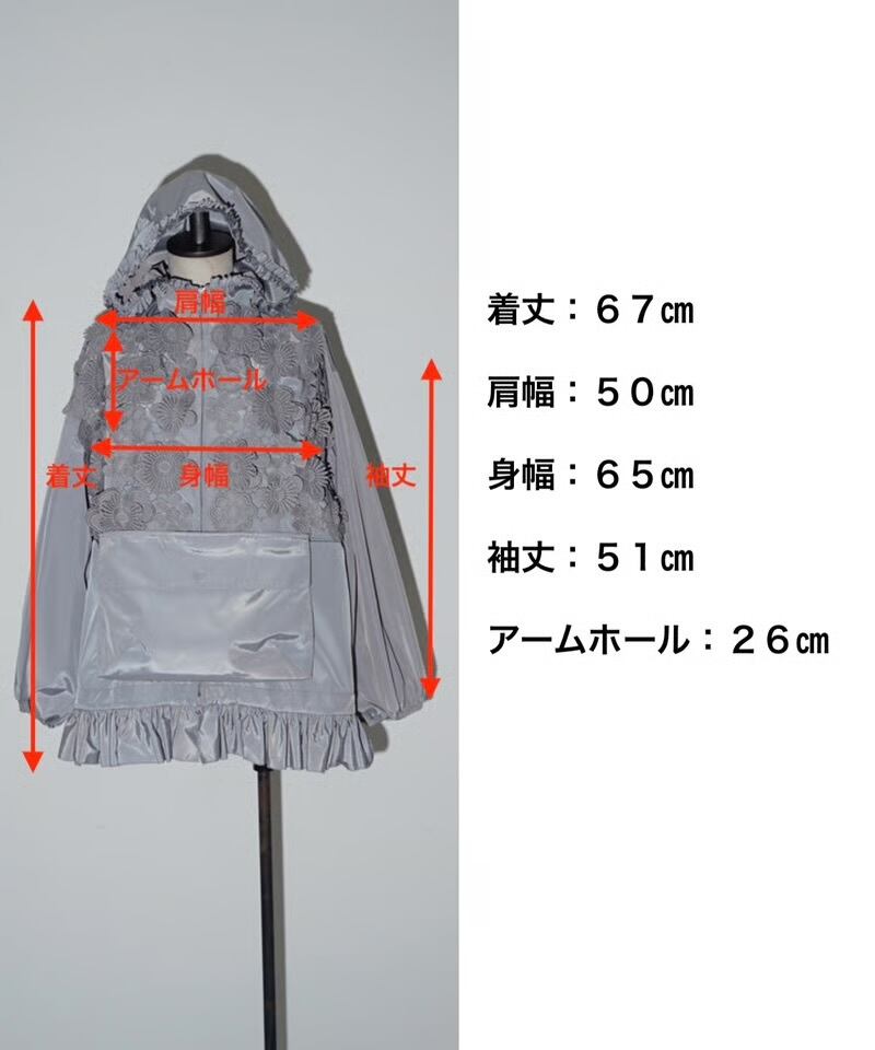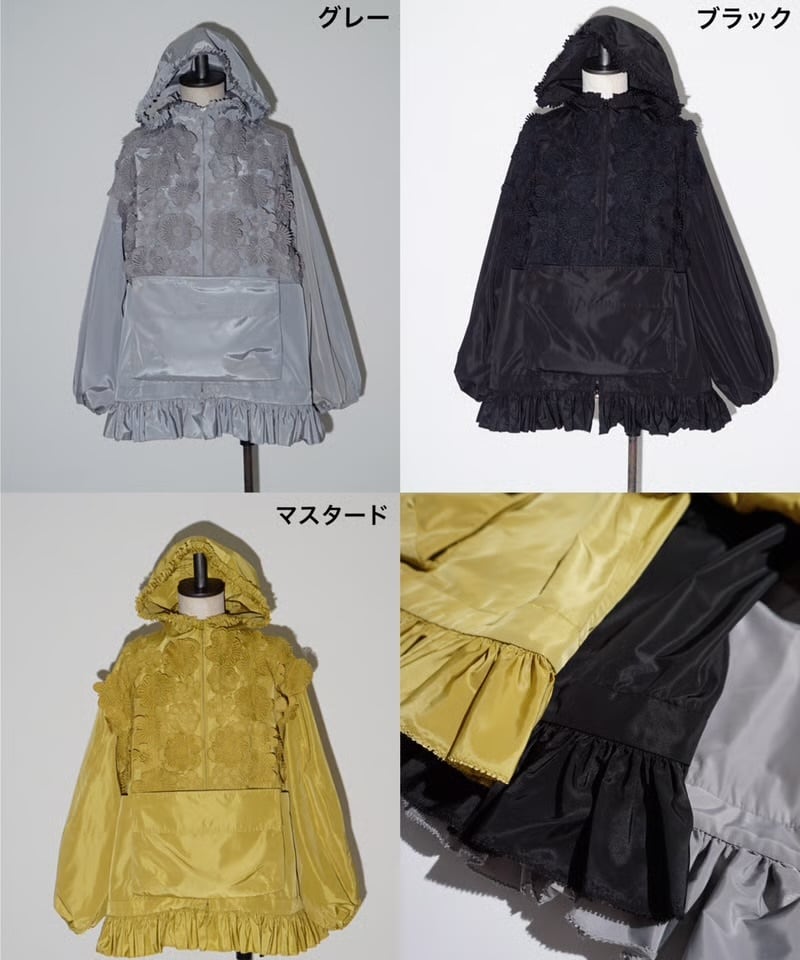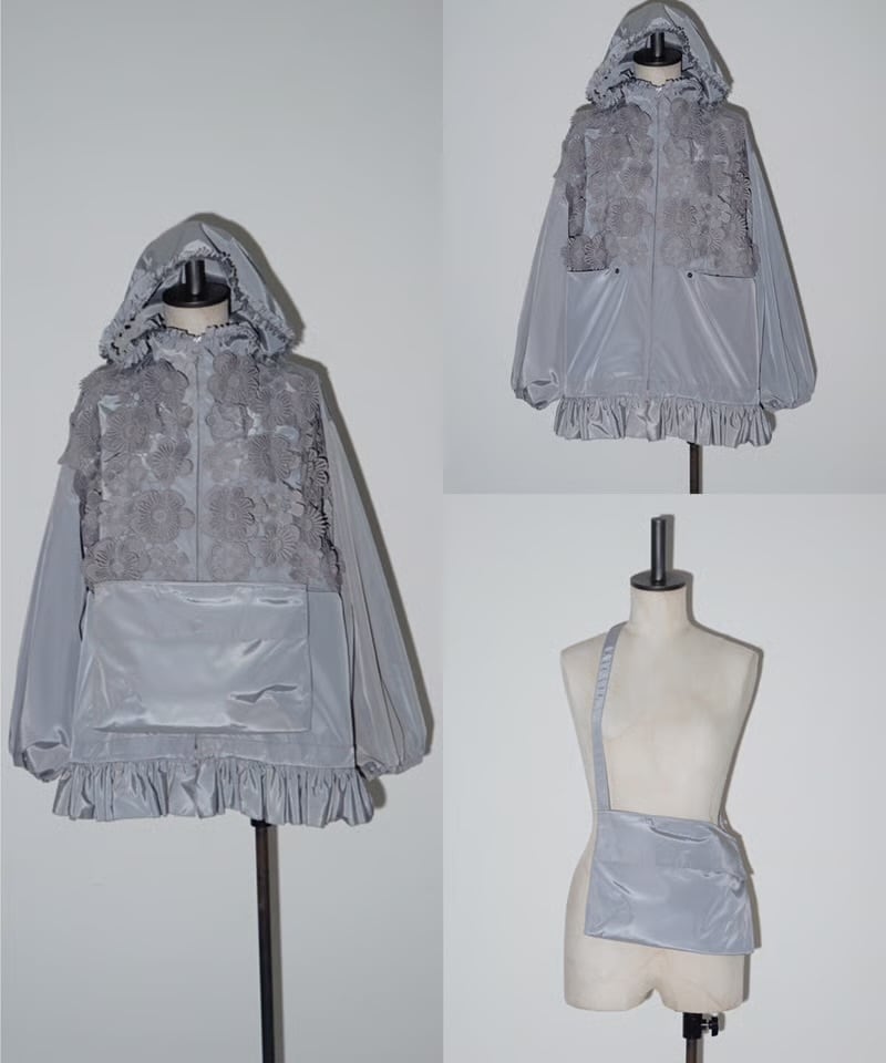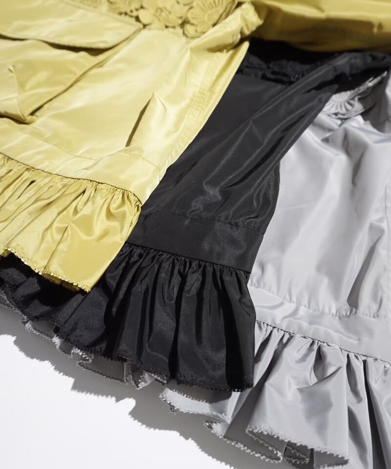 新型のタフタのアノラック型ブルゾンです。アノラックは通常、プルオーバーでフロントジップが全開にならないタイプが主流ですが、女子にはメイクが服に付く恐れがありあまり向かない。でもフロントのカンガルーポケットは付けたい、と考え、工夫を凝らしました。ドットボタンでフロントのカンガルーポケットが取り外し可能で外すと、ジップ開閉ができるというもの。フロントのフラワーレースはこれでもかと言うほど装飾しました。フロントに立体的な装飾が欲しくてレースを叩きつけています。試験的に作ってみたけれど、取り外しが出来て前が全開になるのはとても着やすい。フロントポケットは外したままでもドットボタンは見えないようにポケットに隠れる仕組みにしました。試行錯誤で出来上がったデザインです。カンガルーポケットはカジュアルに見える為、外したままで着用も良いかと思います。レディライクなフラワーレースと、アノラックのメンズライクな雰囲気のコンビネーションが新鮮に感じます。レースは染めを施し、本体生地と同色で仕上げています。