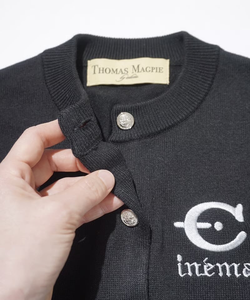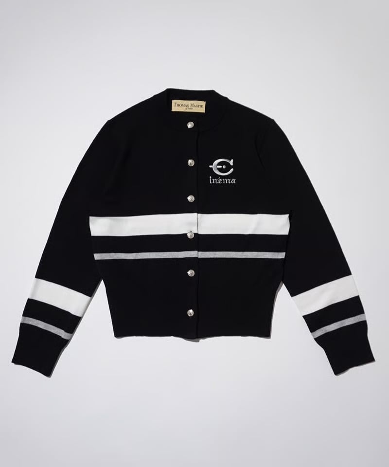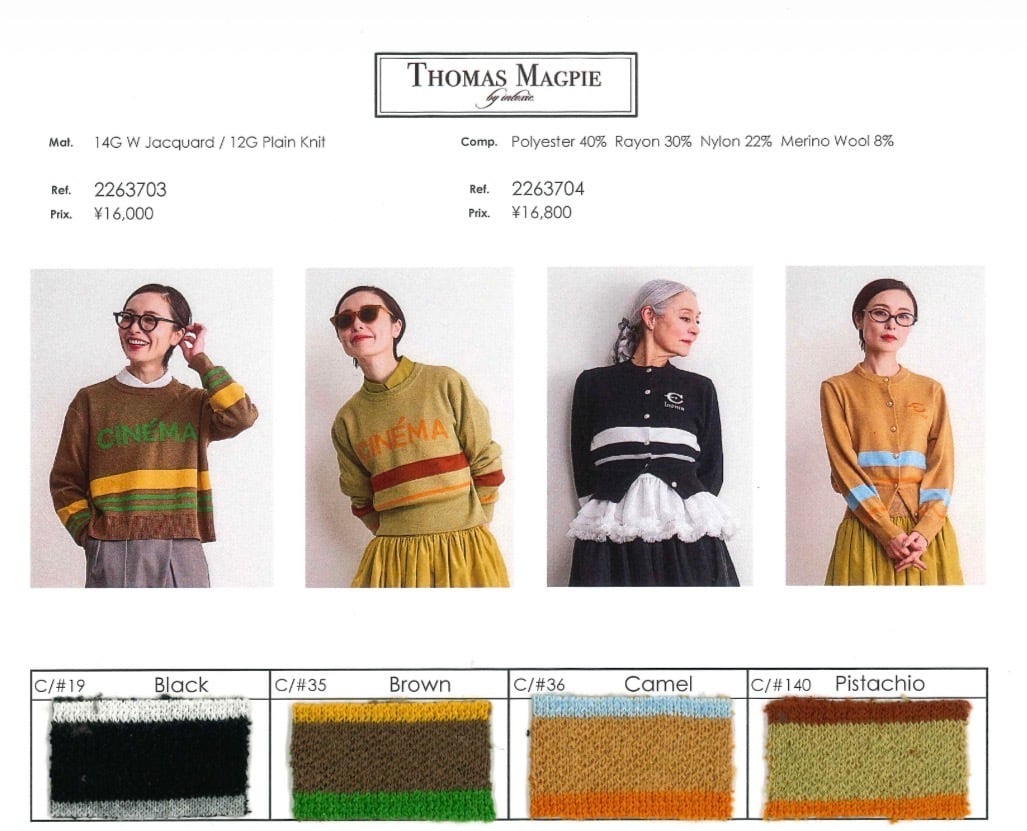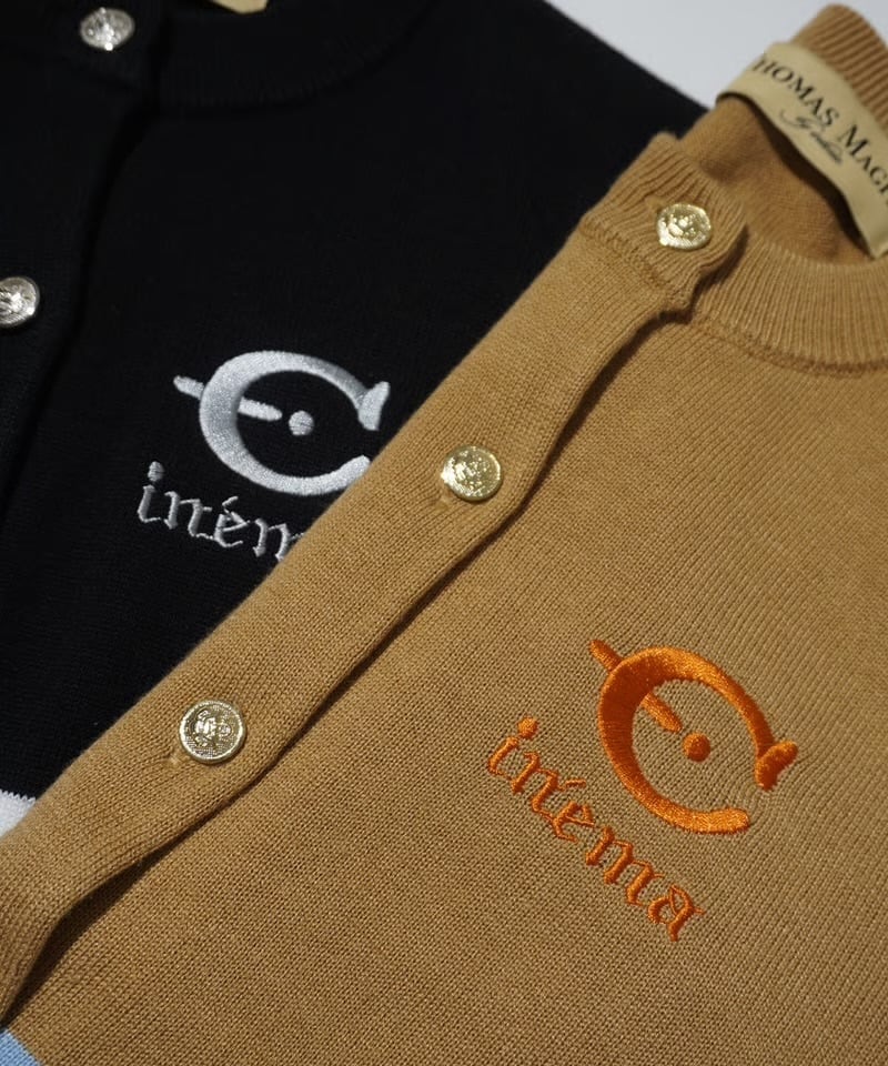 ふつう体型から、ややふっくらの方までが着ることが出来ます。コットンライクな12Gの薄手の細めの糸で春、秋冬まで長く着れるニットにしました。袖と身頃に2色のラインをアクセントにしているデザイン。今回のテーマである映画’’CINEMA’’とフランス語で刺繍を胸にワンポイントで入れています。ボタンはキャメルにブルーライン、金ボタンを配しました。ブラックはホワイトのライン、シルバーボタンです。最近はコンパクトなニットを好みます。1つあるときちんと感があって使えるユースフルなカーディガンです。キレイめに着たい方や痩せ型の方には特にお勧めします。