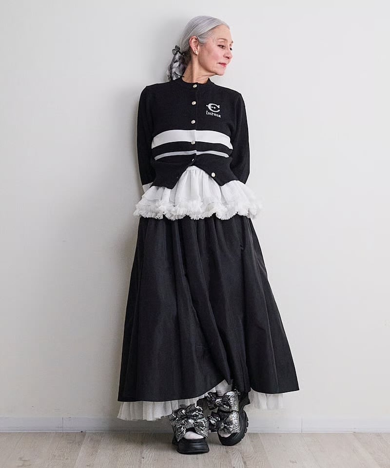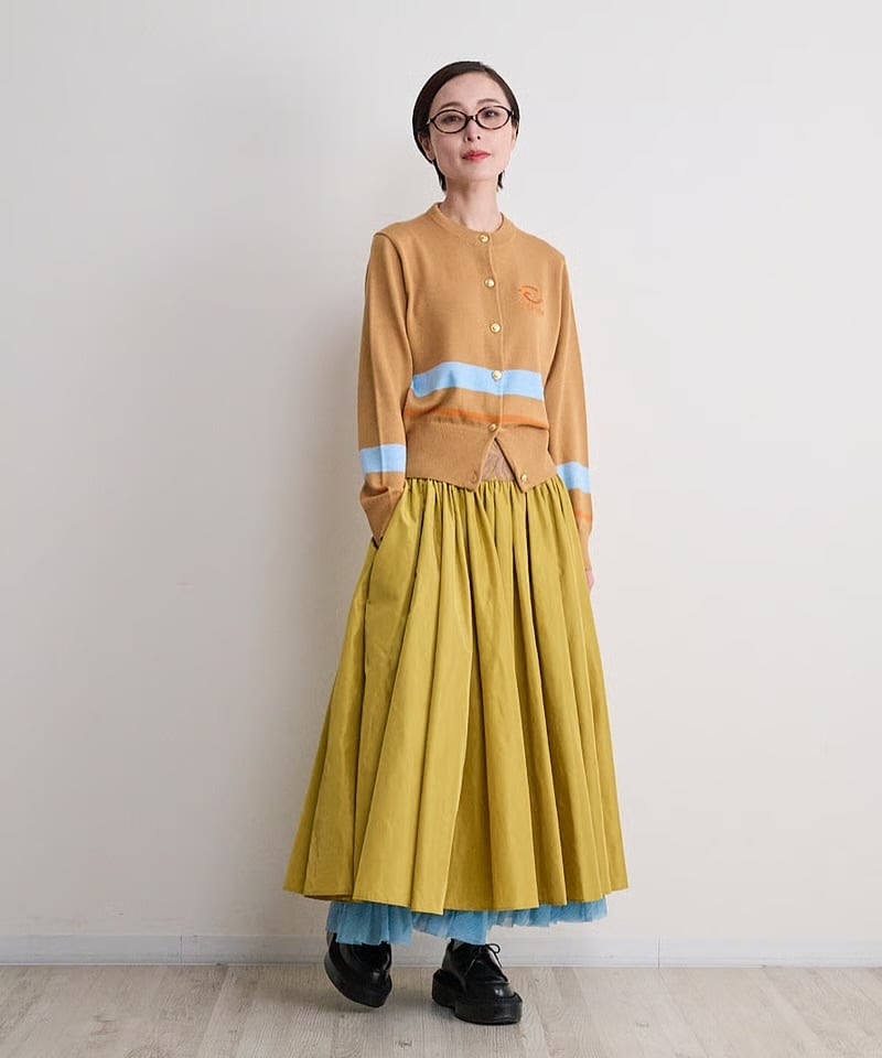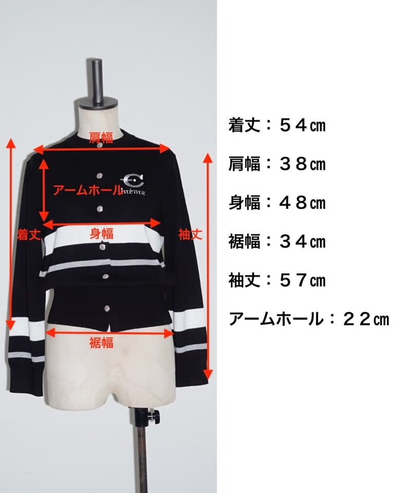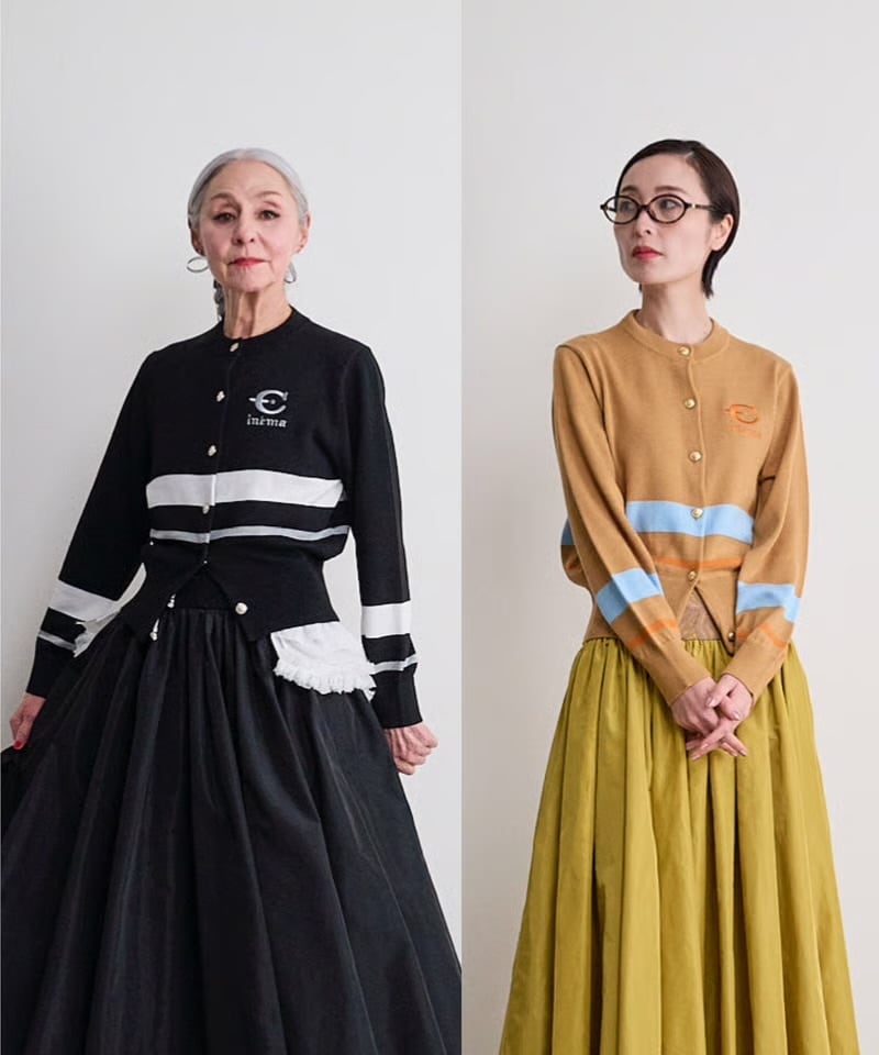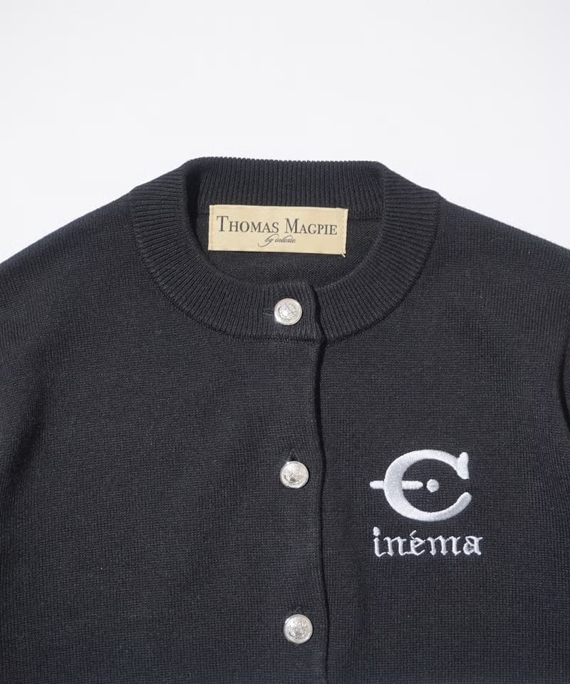ふつう体型から、ややふっくらの方までが着ることが出来ます。コットンライクな12Gの薄手の細めの糸で春、秋冬まで長く着れるニットにしました。袖と身頃に2色のラインをアクセントにしているデザイン。今回のテーマである映画’’CINEMA’’とフランス語で刺繍を胸にワンポイントで入れています。ボタンはキャメルにブルーライン、金ボタンを配しました。ブラックはホワイトのライン、シルバーボタンです。最近はコンパクトなニットを好みます。1つあるときちんと感があって使えるユースフルなカーディガンです。キレイめに着たい方や痩せ型の方には特にお勧めします。