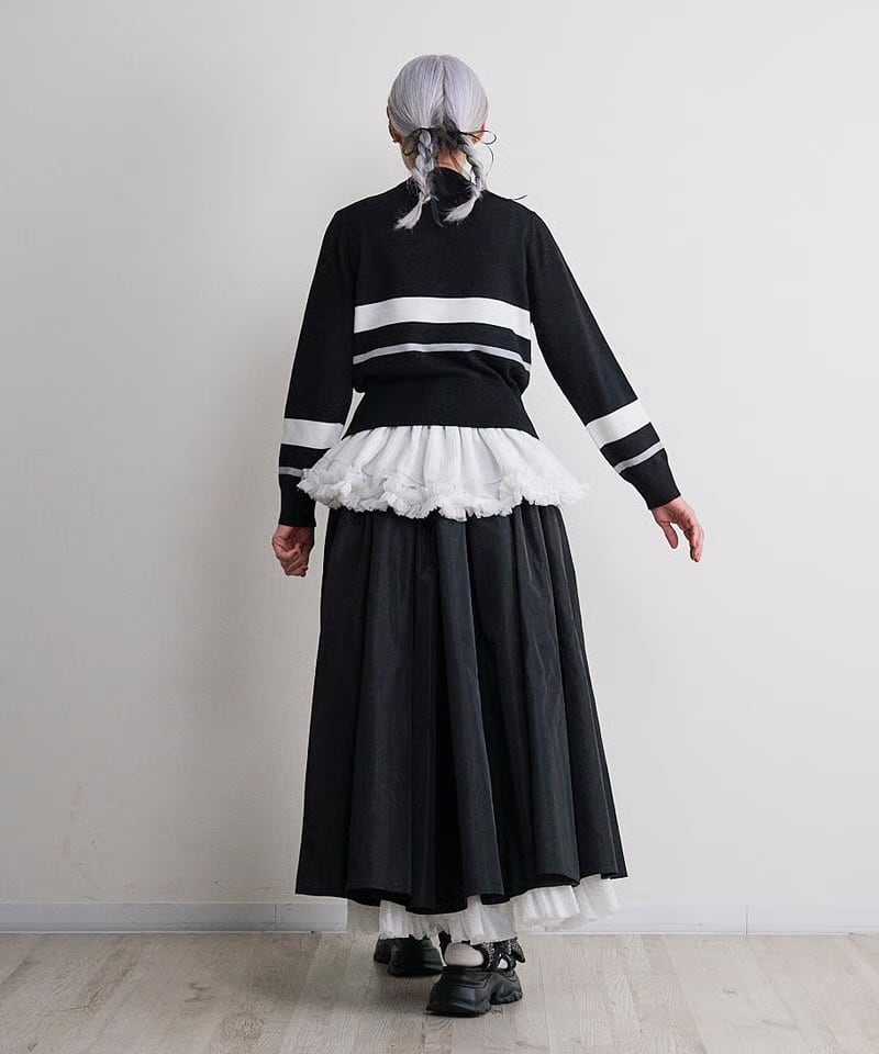 コンパクトサイズのクルーネックのカーディガンです。今回はトーマスマグパイとしてはコンパクトなサイズ感にしています。ストレッチ性があるのでダブつきを回避してスカートなどに合わせやすいサイズ感。