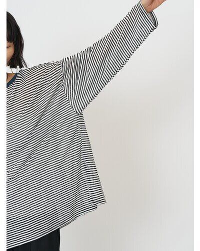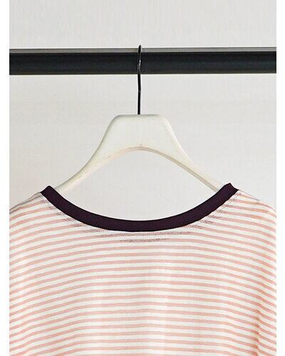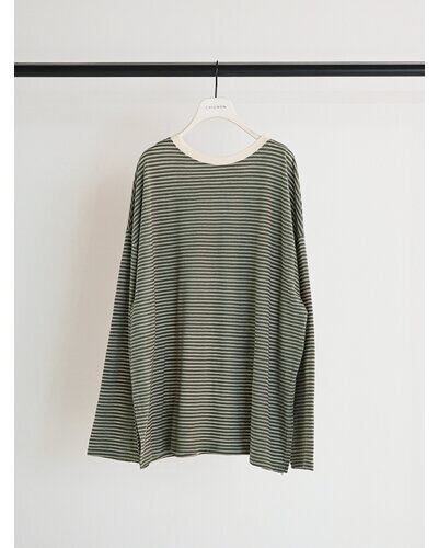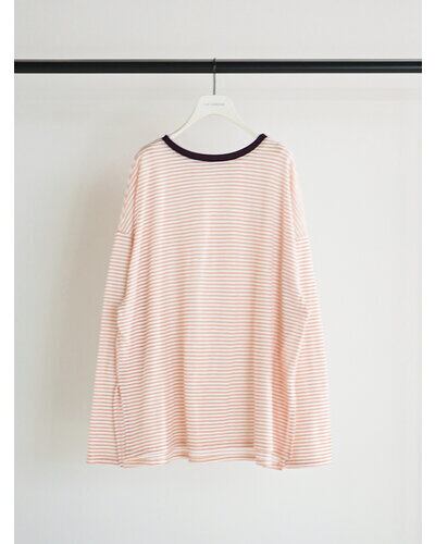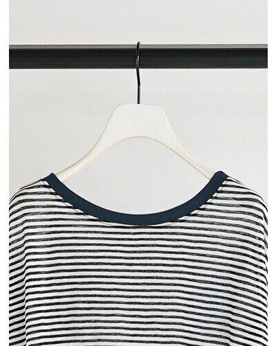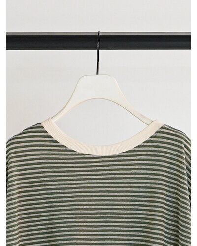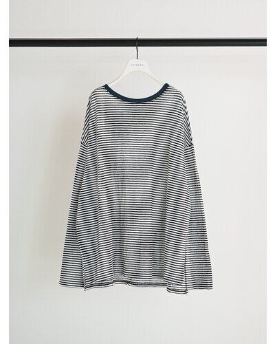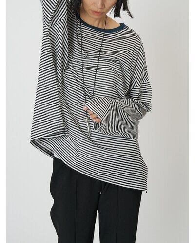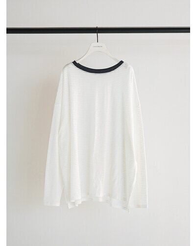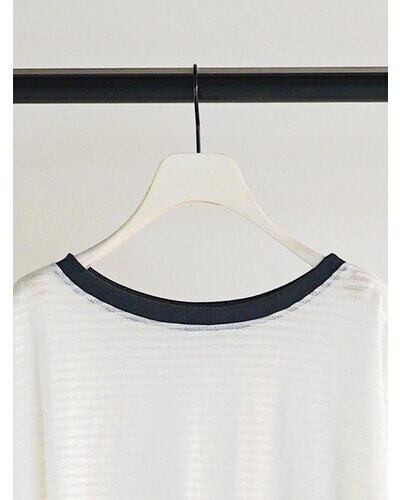 以前ご好評を頂いておりましたシアーボーダーカットソーをリバイバル。配色の衿がトレンド感を増し、さらに”今っぽい”1枚に仕上がりました。程よいシャリみと透け感がスタイリングに軽さを出し、春ムード全開に。