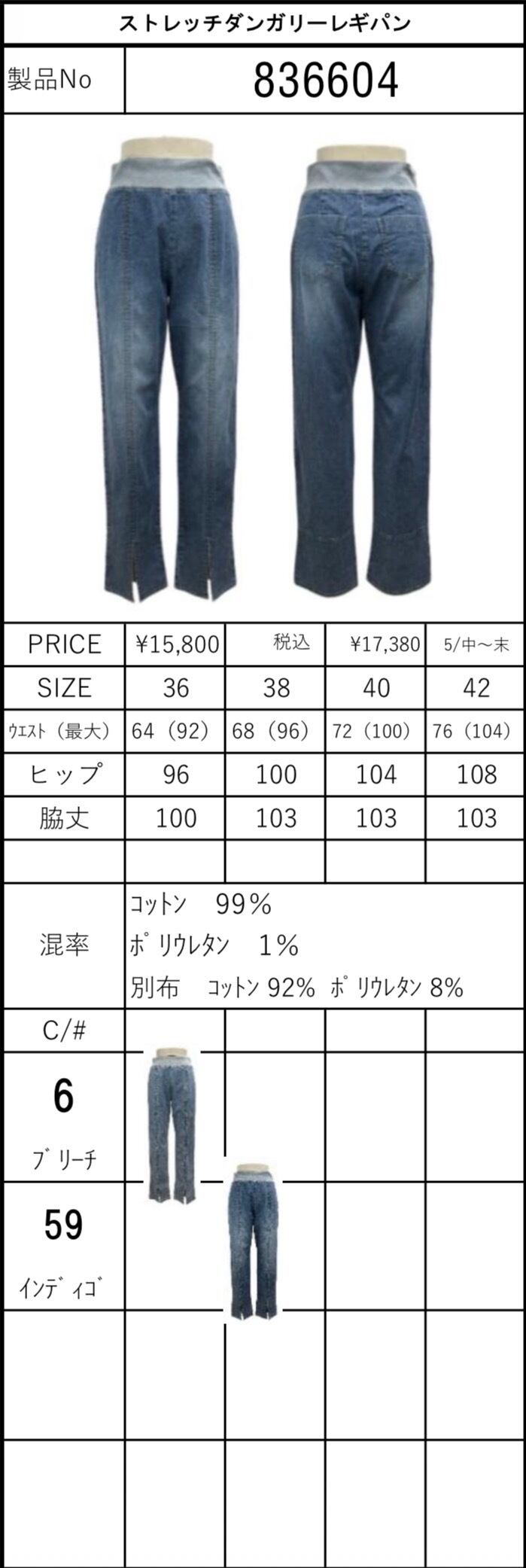 コットン 99% ポリウレタン 1% 別布 コットン 92% ポリウレタン 8%