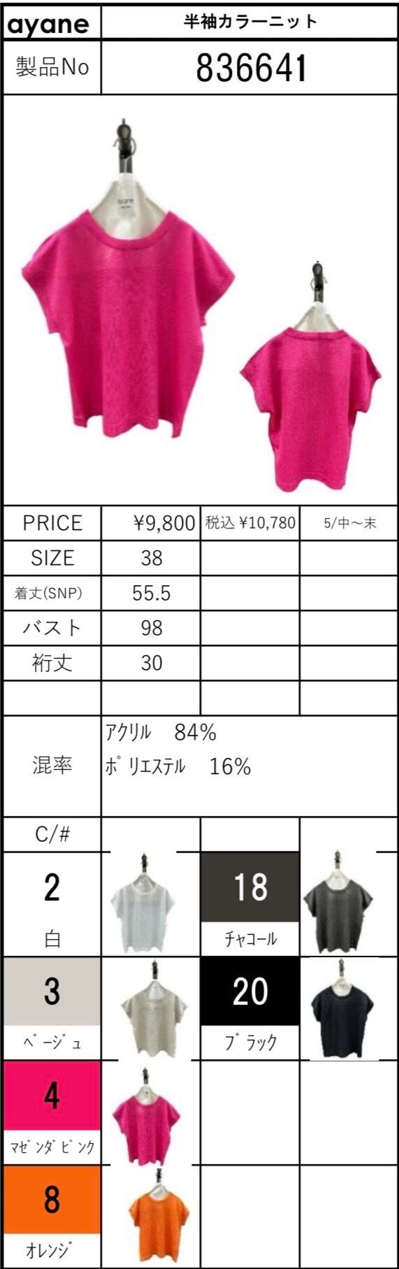 color No.2 白/No.3 ベージュ/No.4 マゼンダピンク/No.8 オレンジ/No.18 チャコール/No.20 ブラック
