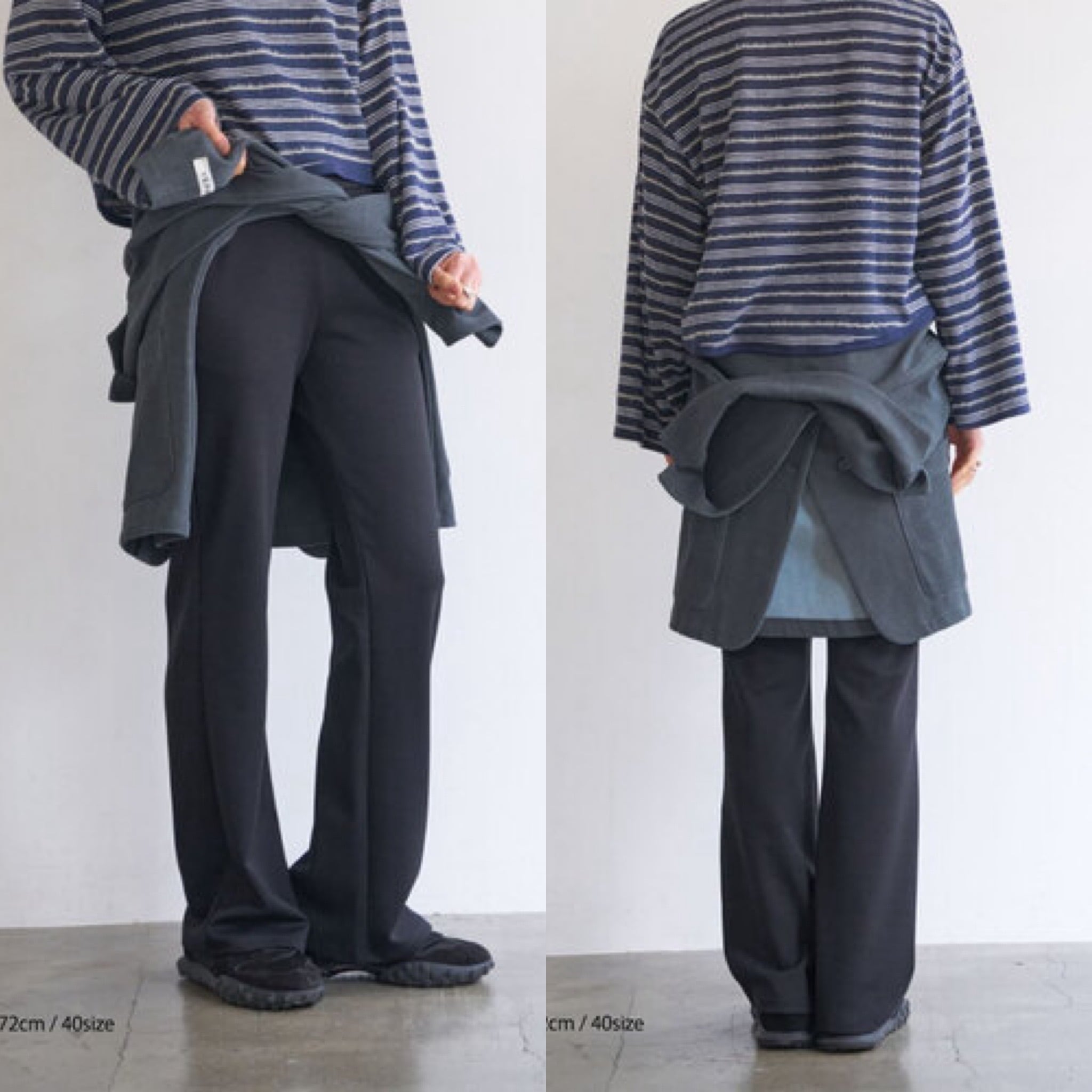 足回りのサイズに少しゆとりを出してきれいに落ちるセミフレアシルエットに仕上げました。