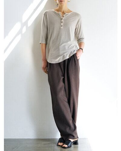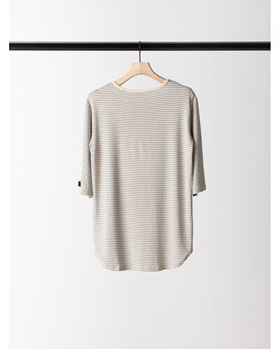 レーヨン混率を高めたしなやかな素材は、なめらかな肌触りと自然な落ち感が特徴。カジュアルなボーダーも、落ち着いた印象で着用いただけます。