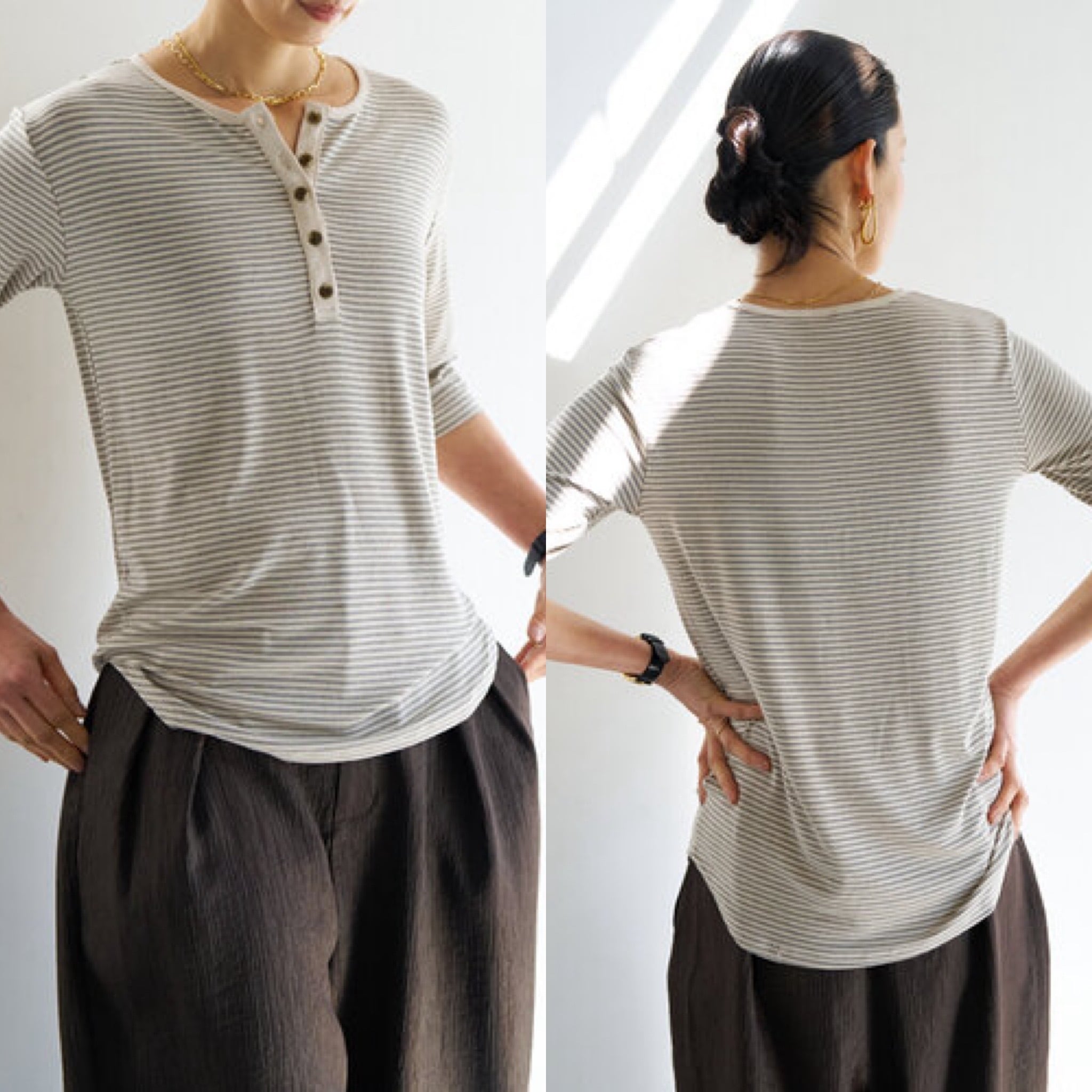 衿とヘンリーあきの前立て部分は、ボーダーのベースカラーに合わせた無地素材でトリミング。さりげない配色が全体を引き締めます。