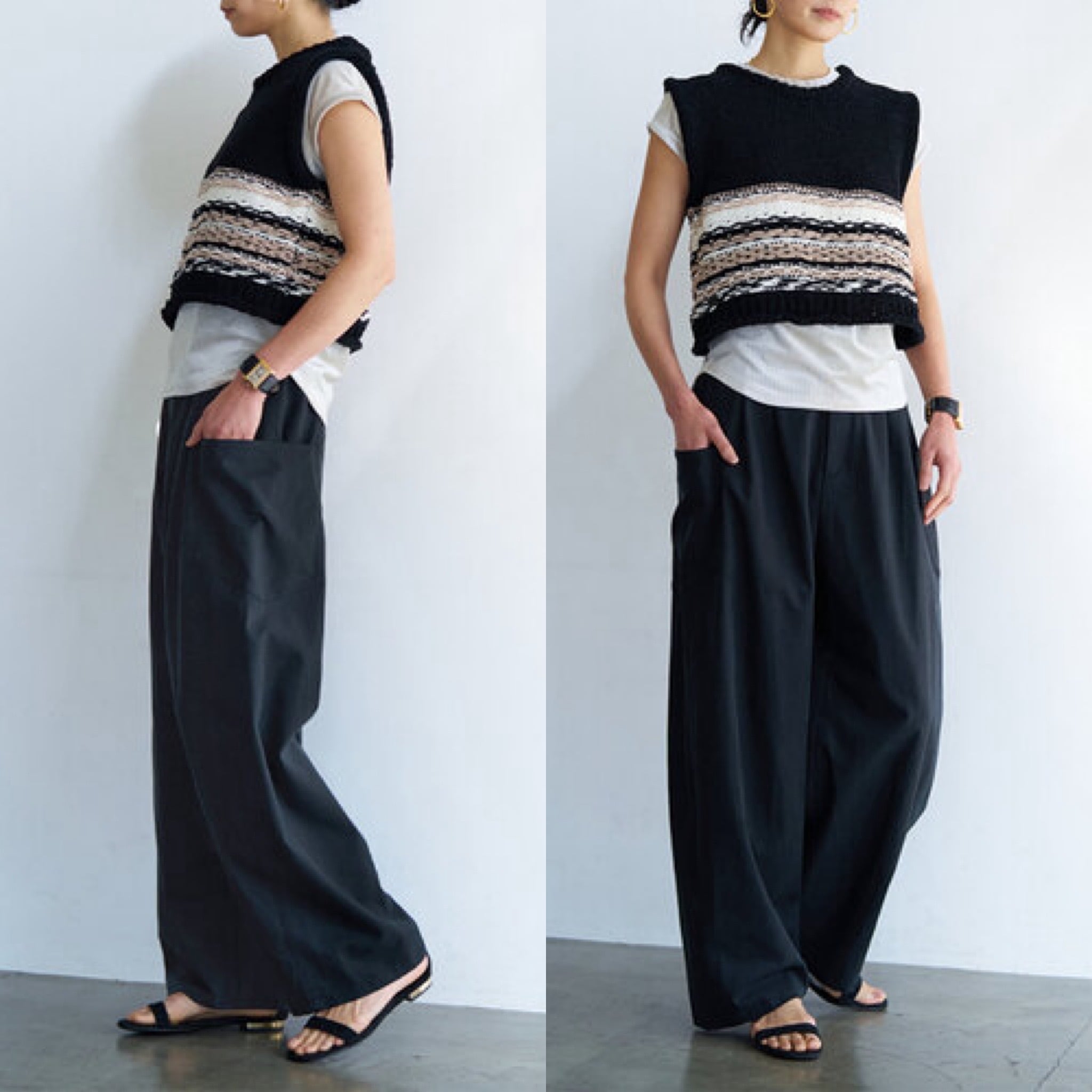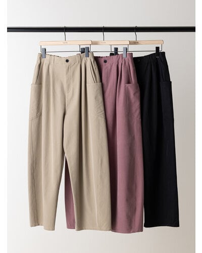 上質なドレープ感と微光沢のあるレーヨン混のツイル生地を使用。女性らしい素材感とマニッシュな雰囲気がMIXされた大人のカジュアルパンツに仕上げました。脇に施したビッグポケットデザインは、ヒップを程よくカバーすることで小尻効果に。とにかく大容量のポケットで、仕事で使用する書類やペットボトルなど、通常のパンツでは入らないような物も収容できるので、実用的なのもうれしいポイントです。ウエストはALLゴムのファスナー開き仕様、ベルト裏に紐をとおしてあるので、さまざまなサイズに対応できるよう設計しています。裾は靴の上で止まるように少し小さめにしてあるので、裾を引きずりにくくなっています。