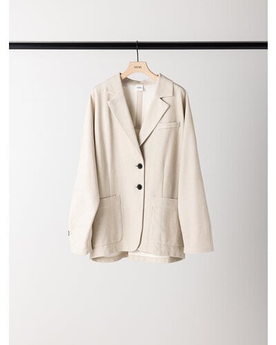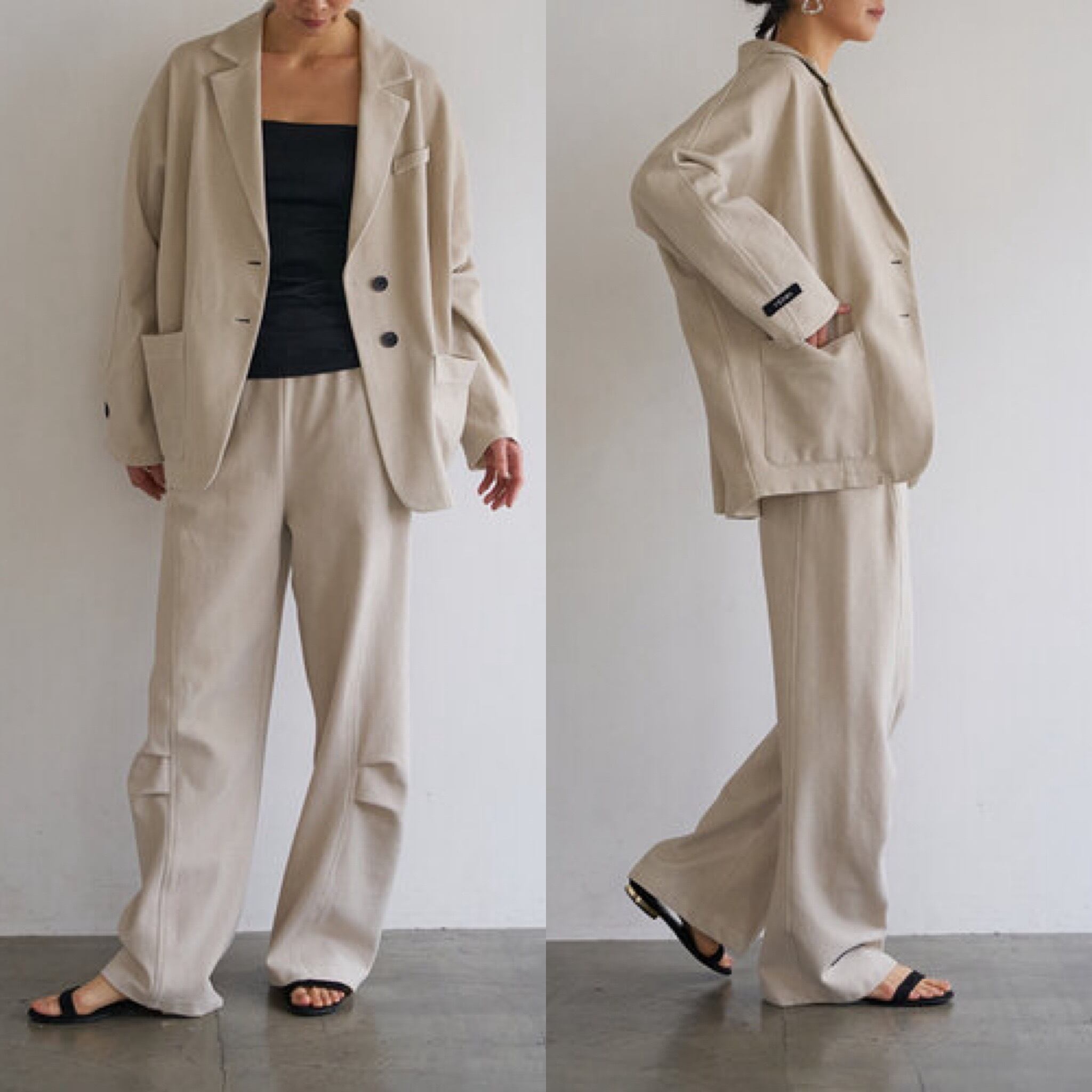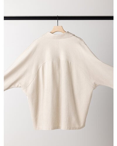 表は鹿の子組織になっていてスポーティーでさわやかな印象に。ダブル編みなので型崩れしにくく、カット素材でもきちんと感のあるジャケットに仕立てています。 製品洗いをして少し色落ちさせるフェード加工を入れることで、こなれたラフな印象をプラスしました。 オーバーサイズのドルマン袖を採用することでゆるっとした抜け感のある女性らしいシルエットに。