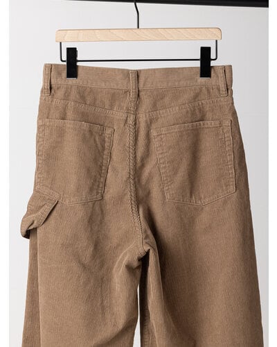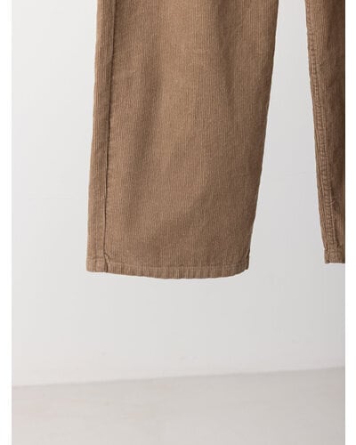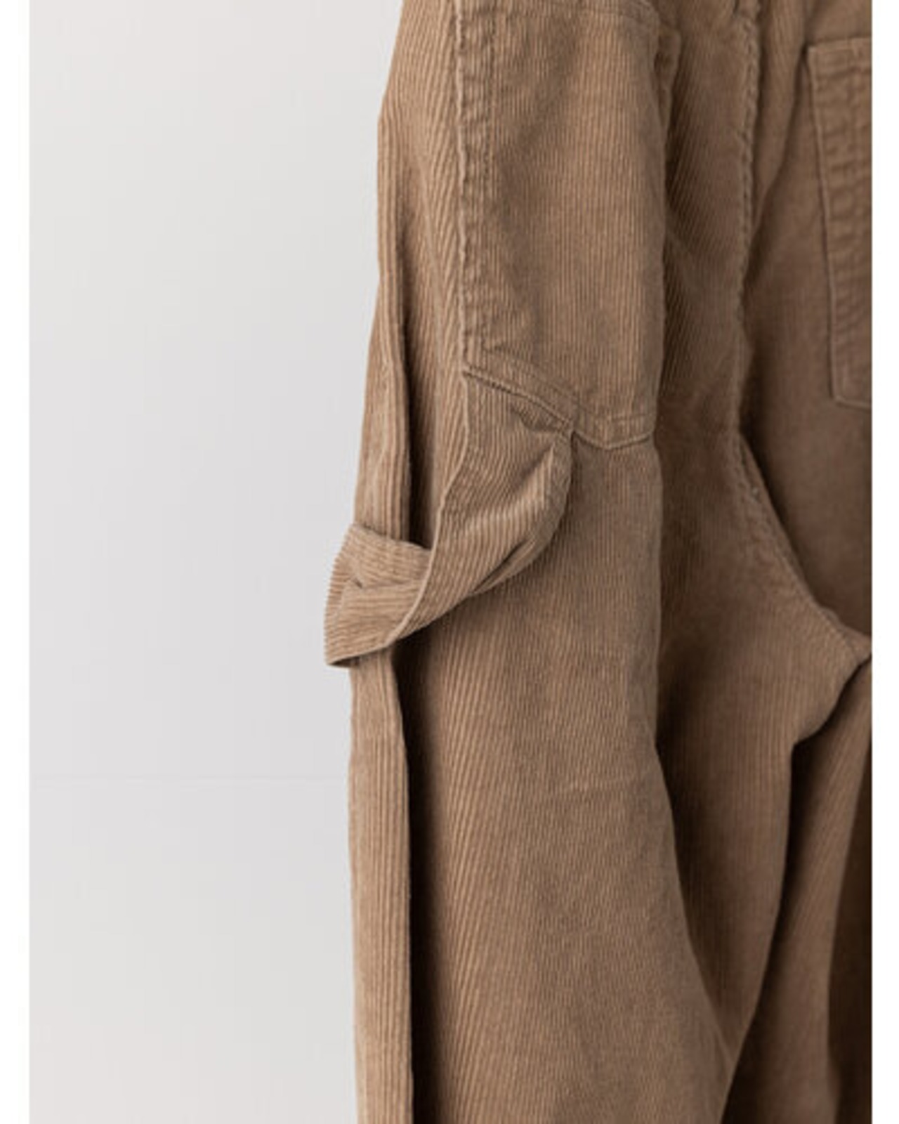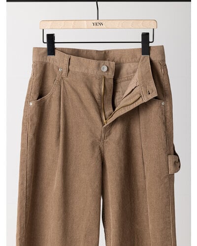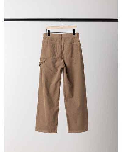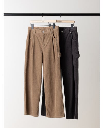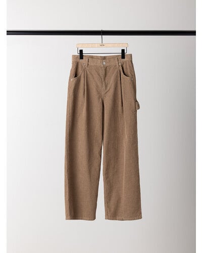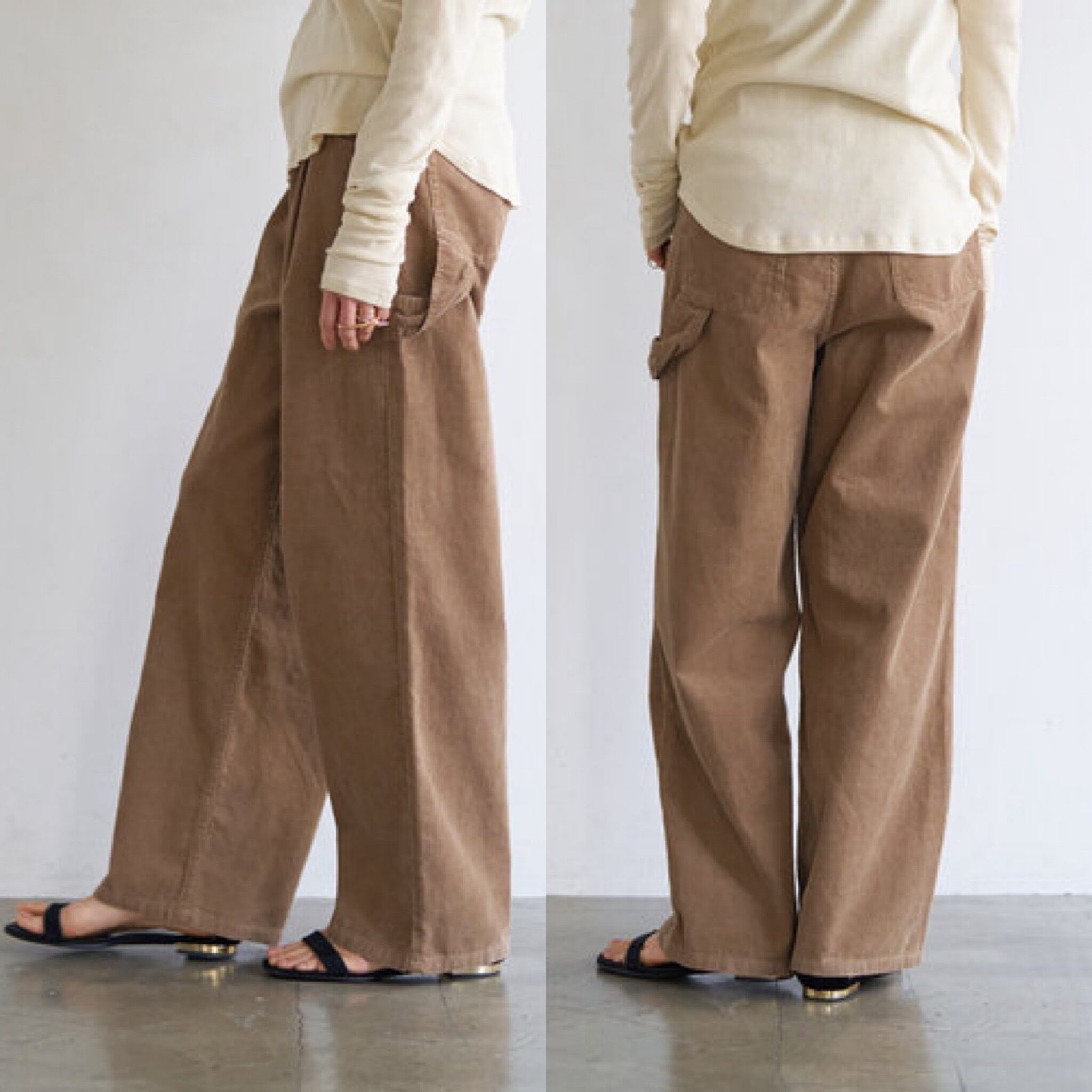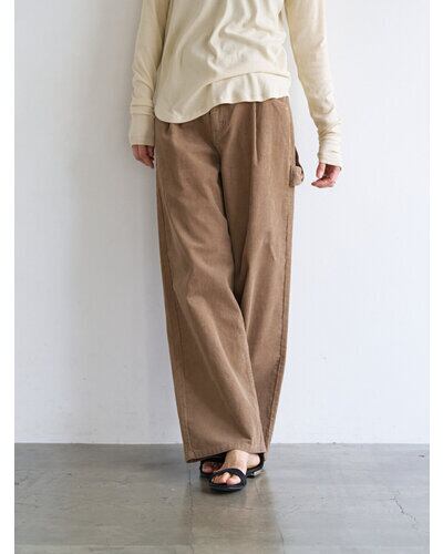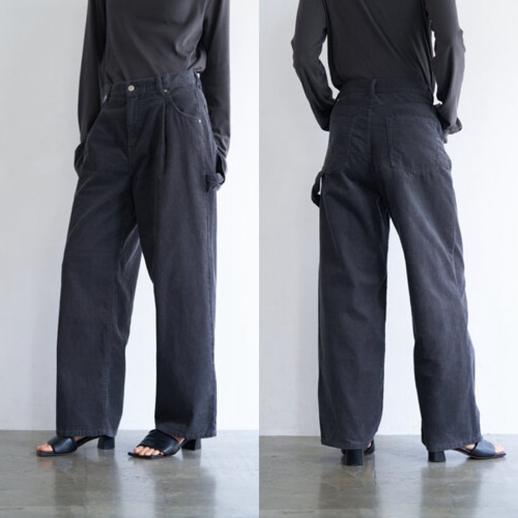 細畝のコーデュロイ生地を使用、しっかりと柔軟加工を入れて柔らかさとビンテージ感をプラスしました。腰位置はハイウエストから少し下げた位置に設定、タックを入れてお腹周りにゆとりをプラスしています。ペインターパンツの特徴であるハンマーループを左脇に付けて、シンプルなデザインに遊びをプラスしました。 やりすぎないくらいのダメージ加工をいれて、平坦な印象にならない、こなれた雰囲気のコーデュロイパンツに仕上げています。