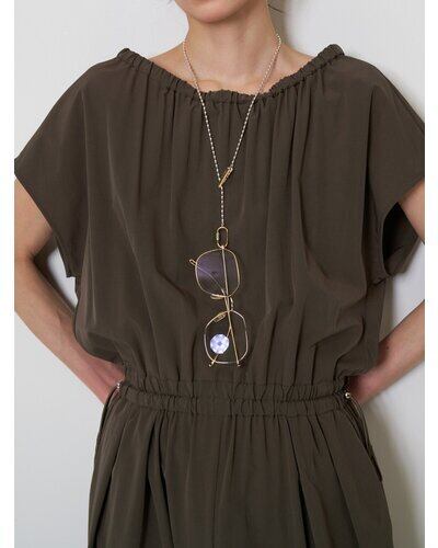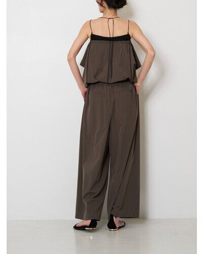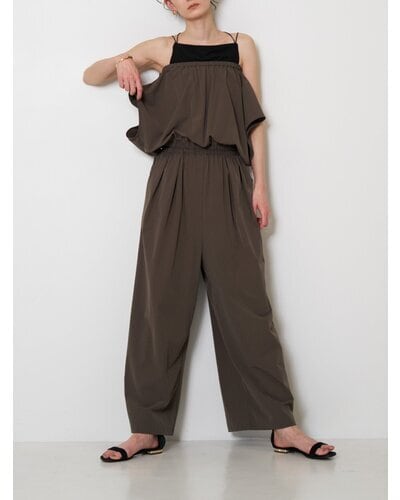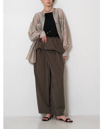 上身頃に入れた繊細なギャザーと、落ち感のあるワイドパンツシルエットが身体のラインを拾わず、リラックスした着心地と洗練された印象を両立。