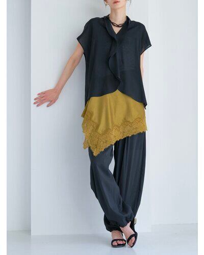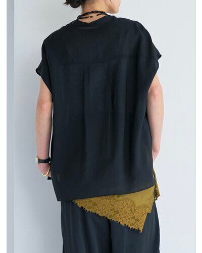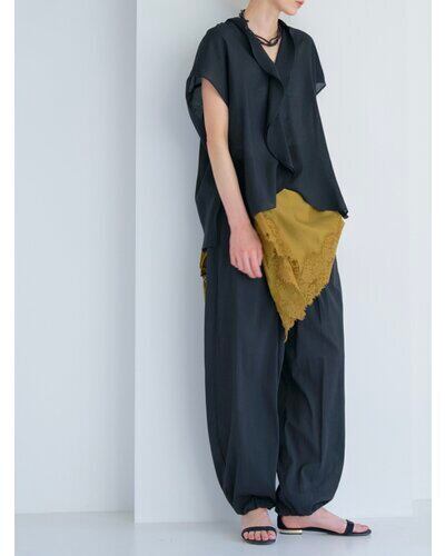 前後差のある着丈でタックインしやすく、ワイドパンツやテーパードパンツにさらりと合わせるだけで、ニュアンスのあるモードスタイルが完成。