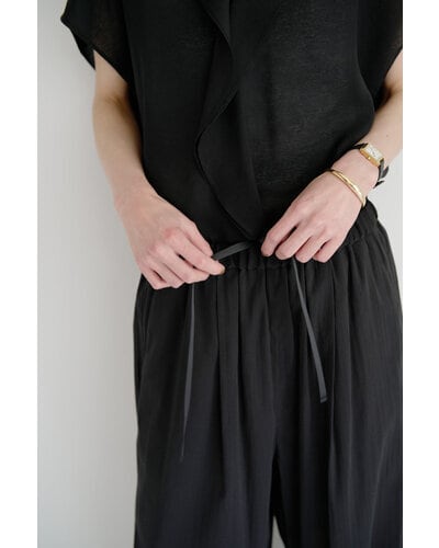 素材は、ナチュラルなシワ感のあるさらっとした肌触り。バンブーの再生繊維を混紡した糸を使用し、接触冷感のある涼やかな着心地で、長い夏でも快適に着用できます。