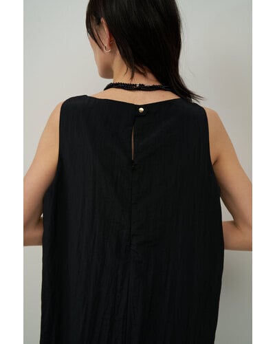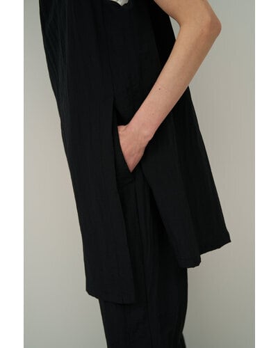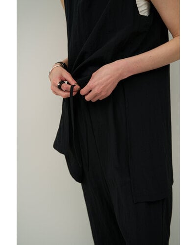 アシンメトリーなチュニックデザインが印象的で、シンプルながらも洗練された存在感を放ちます。ボートネックとすっきりとした肩幅のラインが上半身を美しく見せ、1枚でさらりと着るだけでスタイリングが完成。