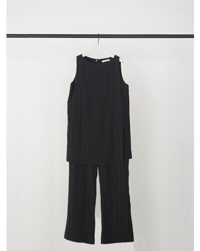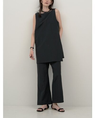 チュニック丈のトップスとパンツを組み合わせた、モード感あふれるコンビネゾン。