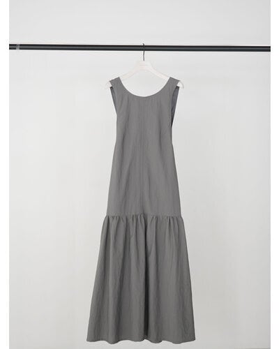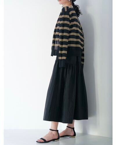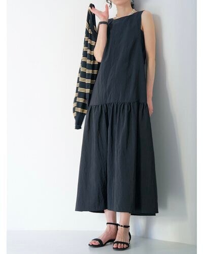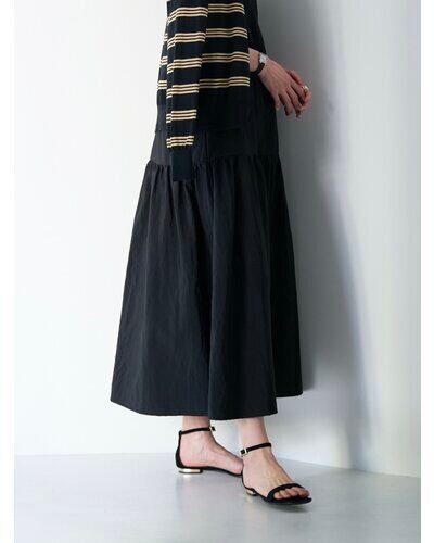 すっきりとしたストレートな身頃から分量感のあるティアードギャザーへと続くシルエットが、甘さを抑えたモードなニュアンスを作り出しています。