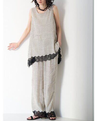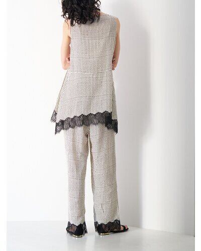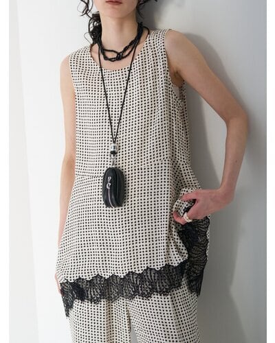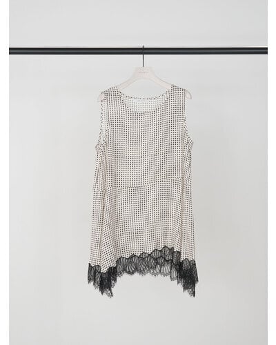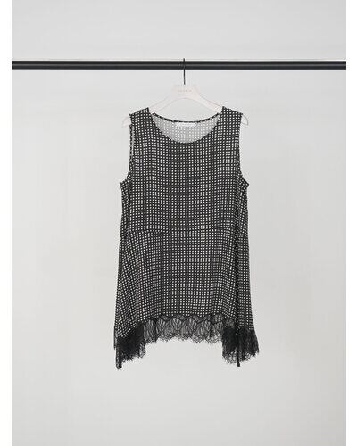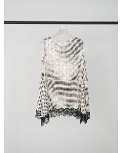 小粒の変形ドット柄に繊細なレースヘムを組み合わせたノースリーブトップス。