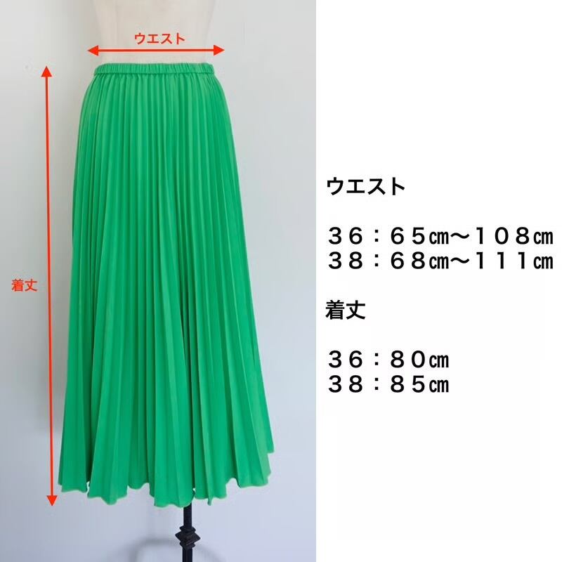 36サイズは着丈80cm、38サイズは着丈85cmです。ウエストはゴムですが、非常に細く柔らかいので、着丈で選んでもらった方が良さそうです。38サイズの方が蹴回しがあり、大きめに広がりが出ます。