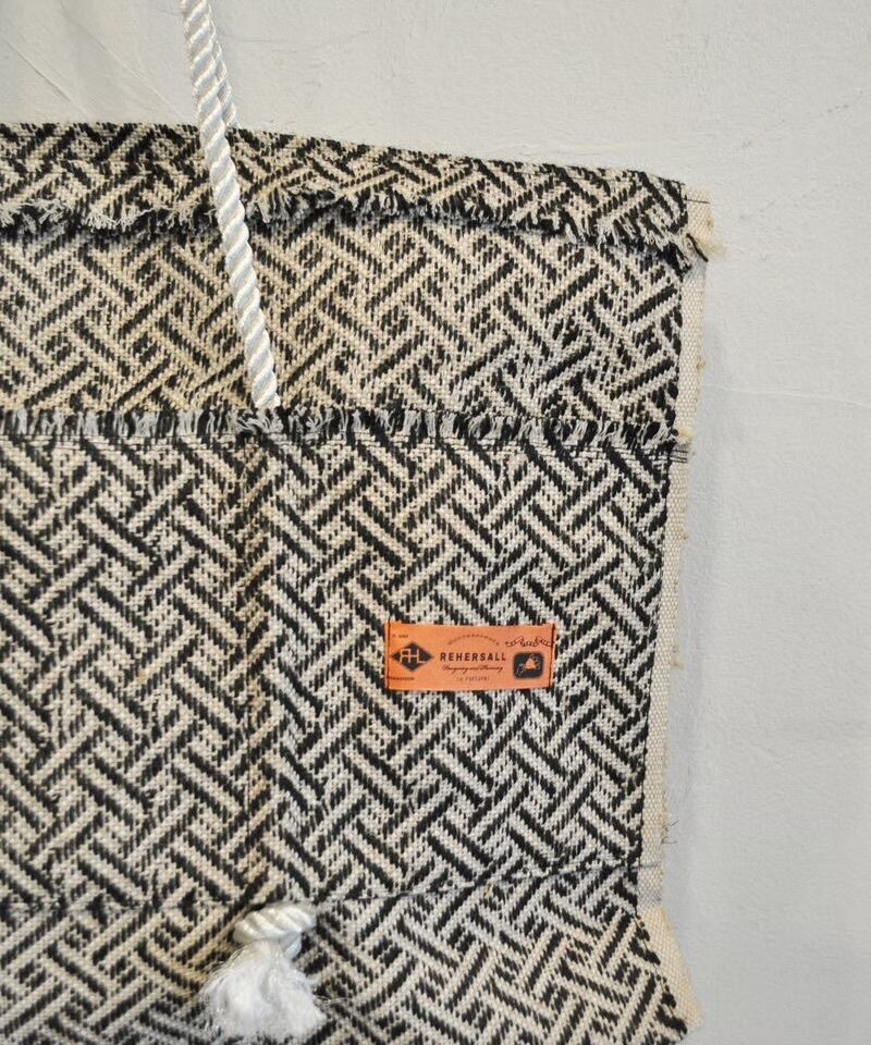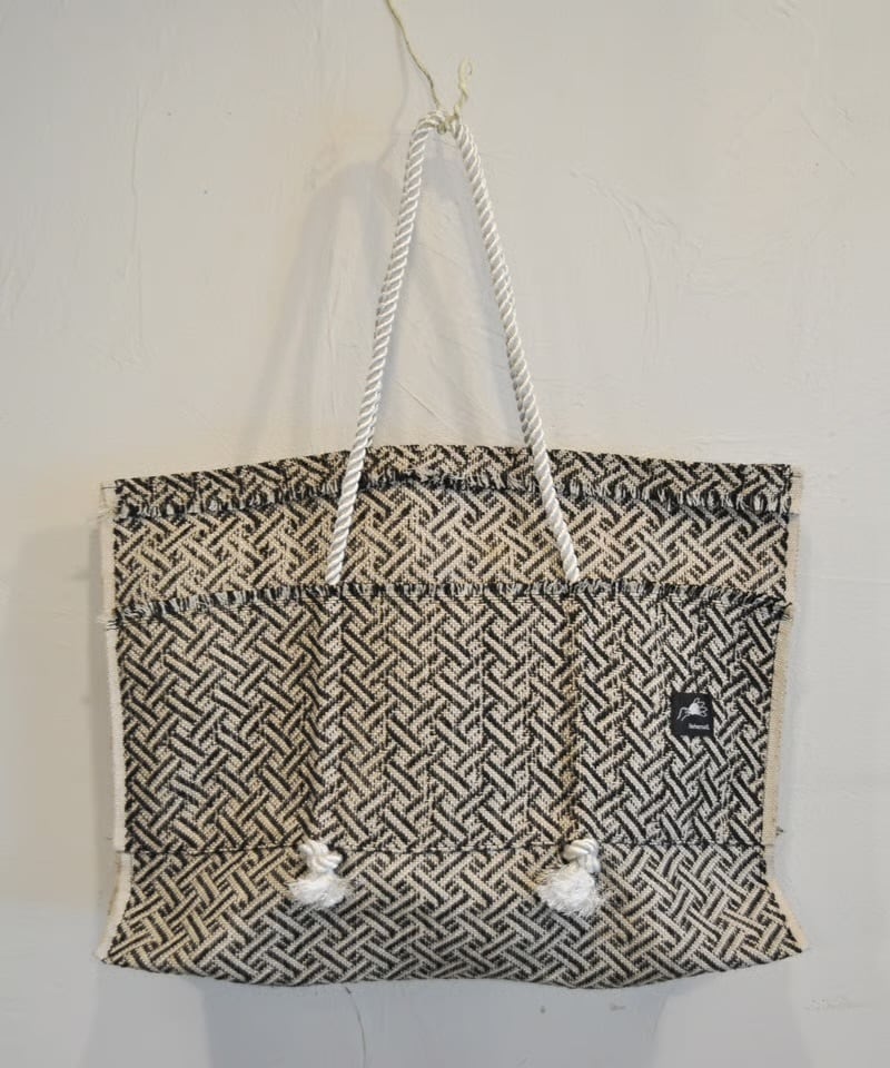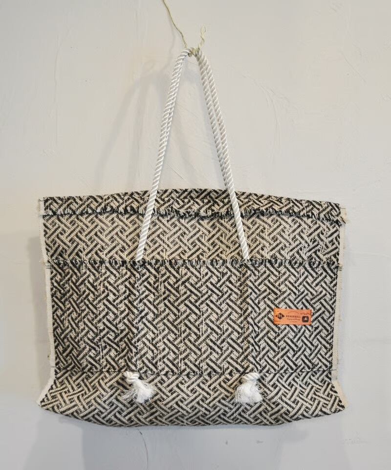 ジオメトリックな柄とジュート素材のざっくり感が特徴の、大容量トートバッグです。 この生地はバングラデシュ発のフェアトレードブランド「TARANGO」のものです。 しっかりとした厚みのある生地で、