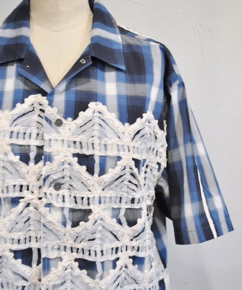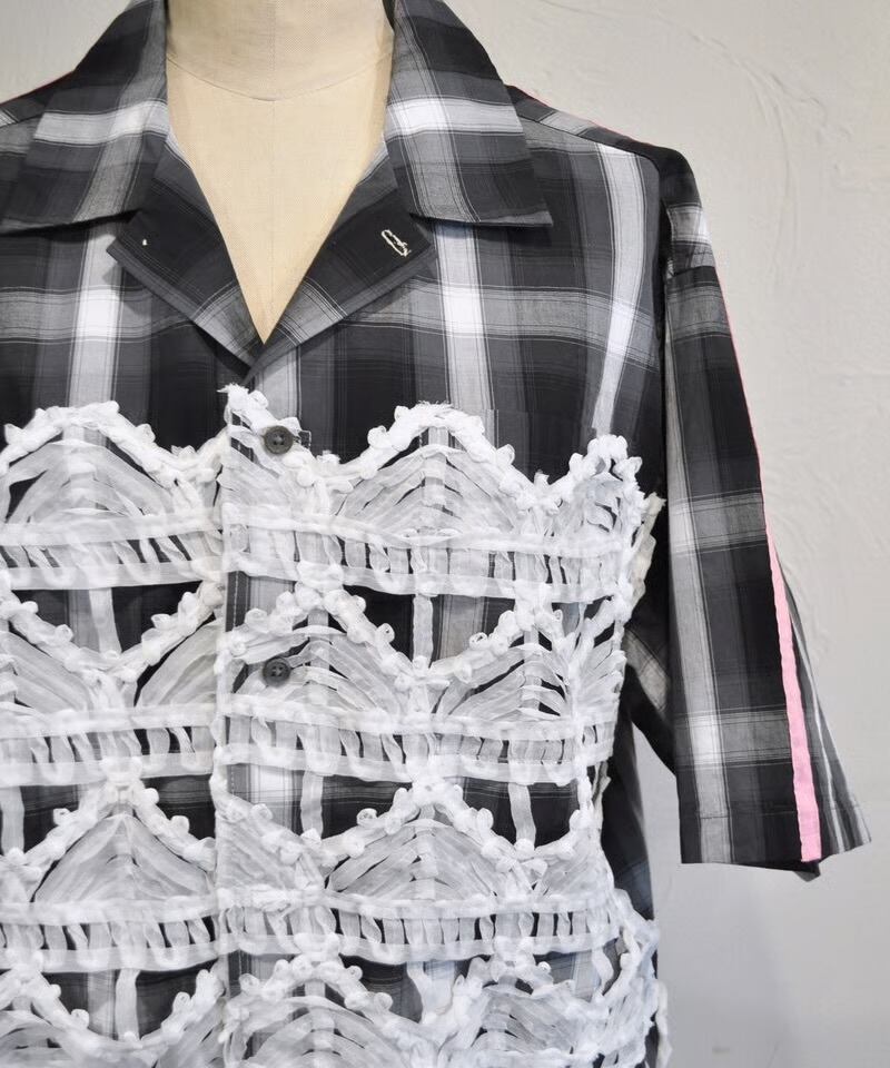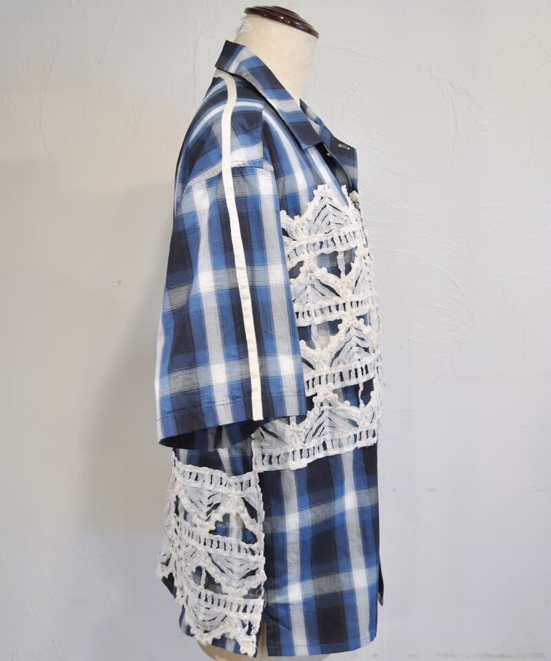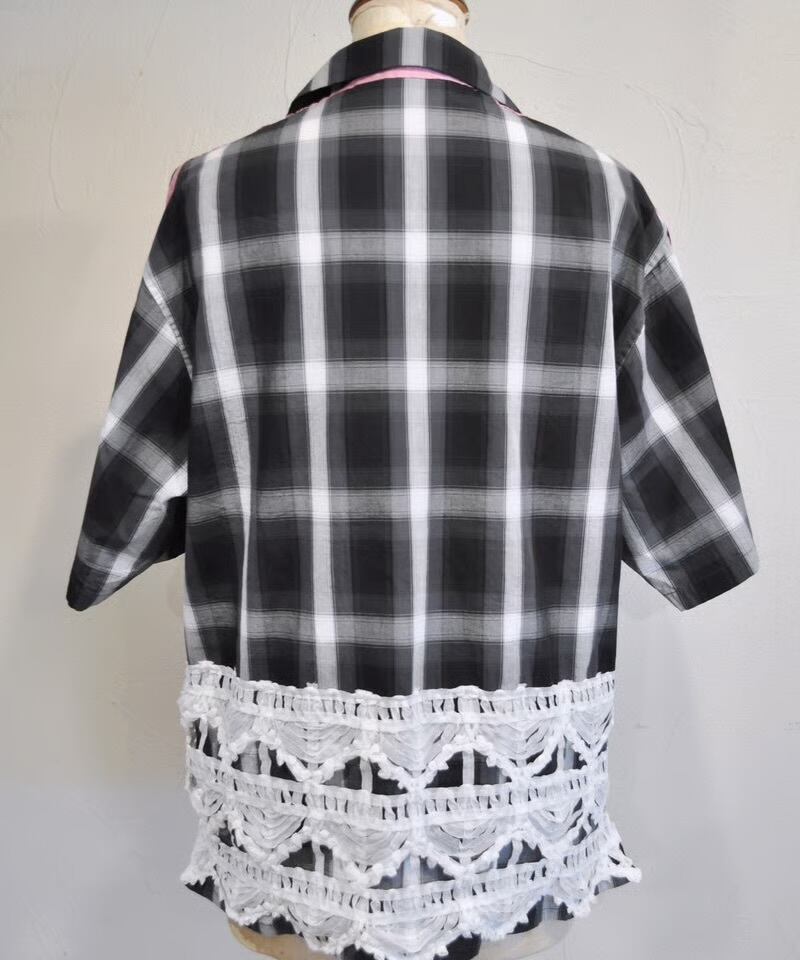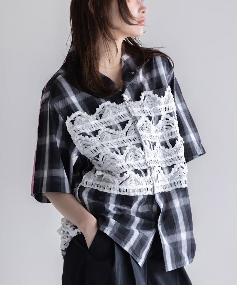 特徴的なラダーレースをフロントとバックに施した、半袖チェックシャツです。 ボーイッシュな開襟シャツにフェミニンなレースを掛け合わせて