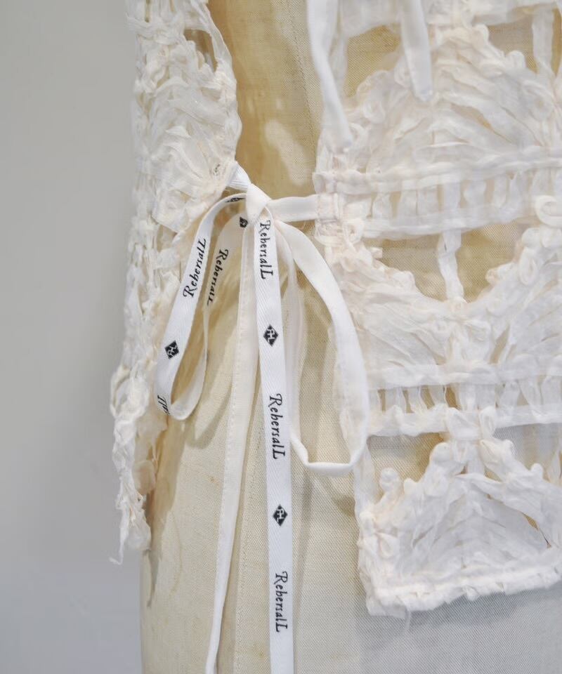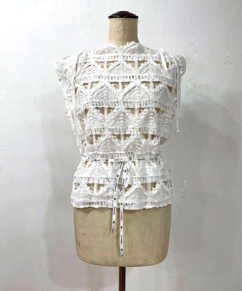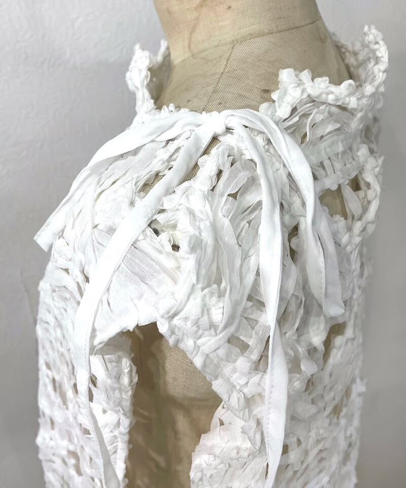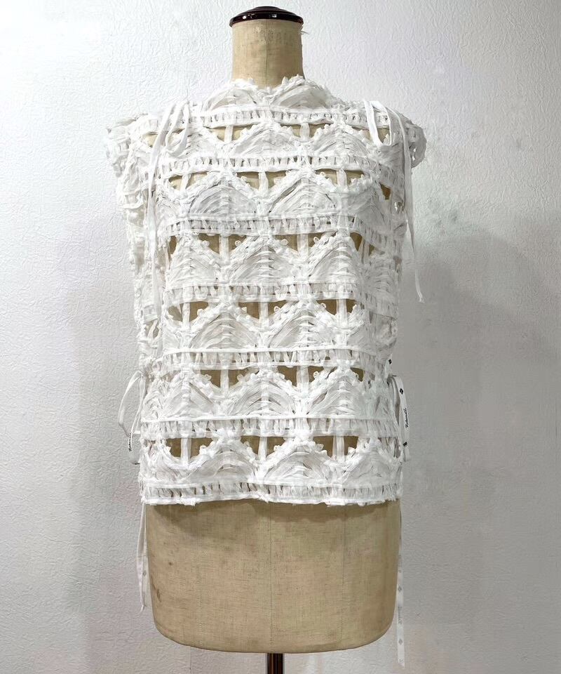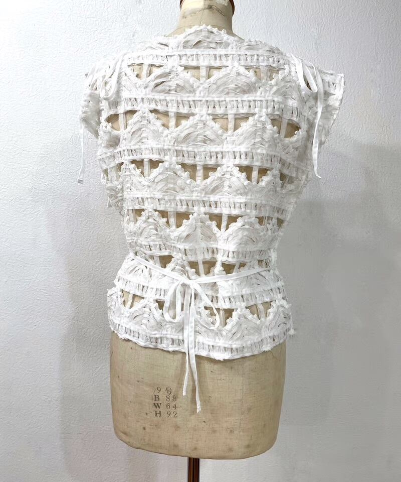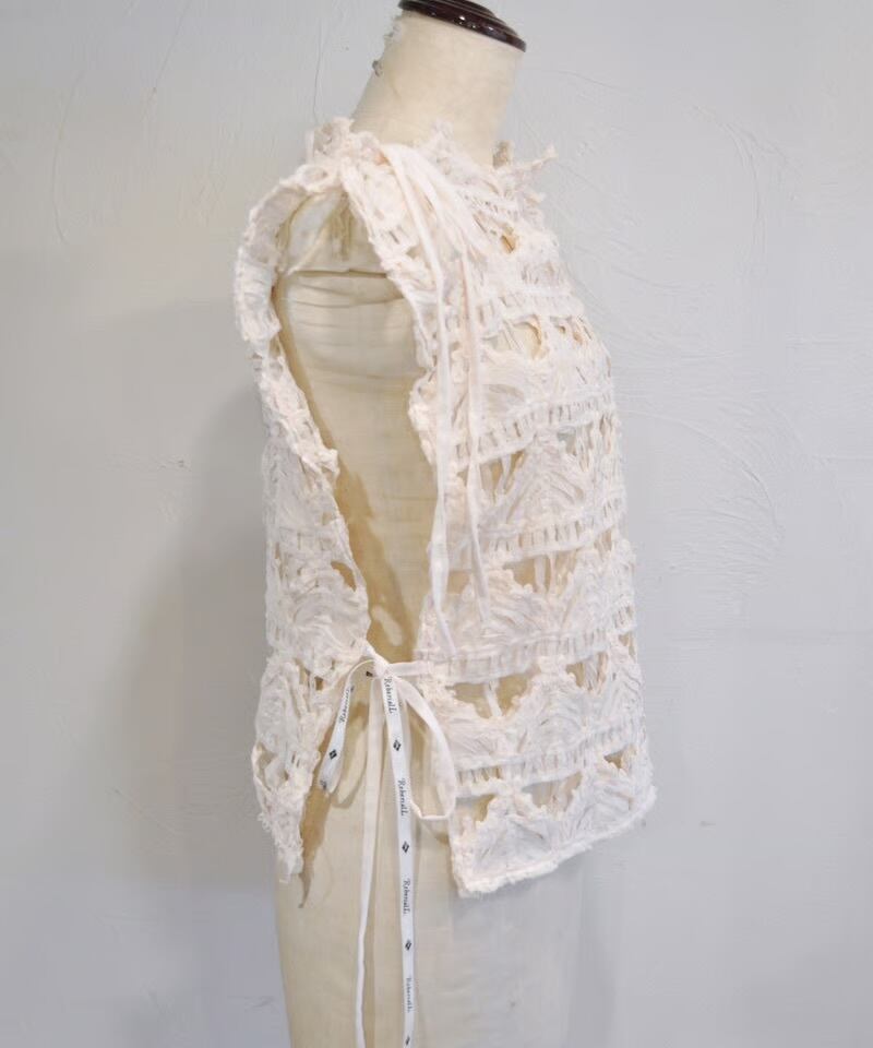 立体感のあるラダーレースをふんだんに使用した、存在感たっぷりのリボンベストです。 肩と脇にリボンがあり、結びを変えて着方を変えられます。