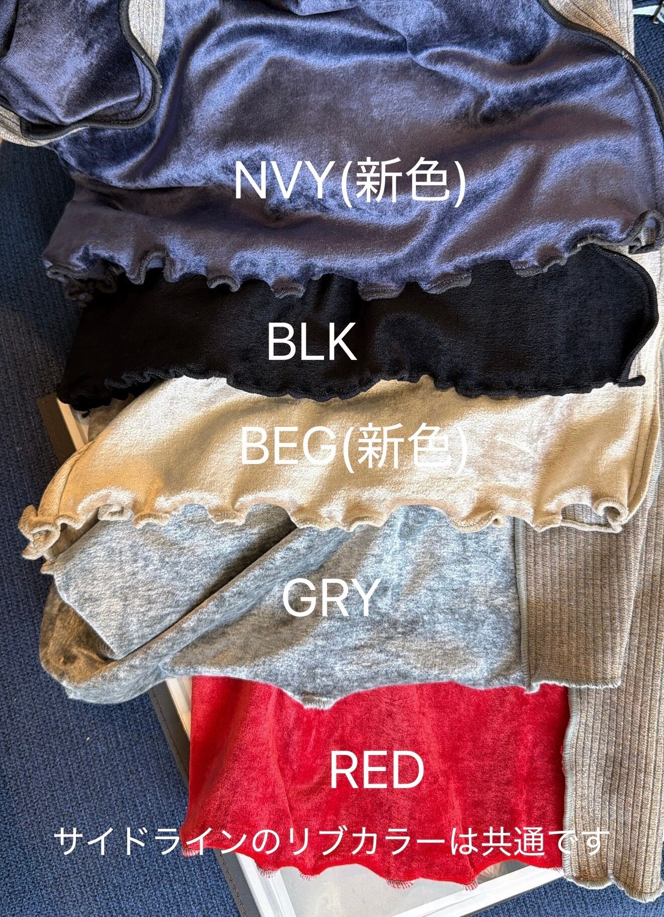 サイドに異素材のラメリブをメロー始末であしらうことにより