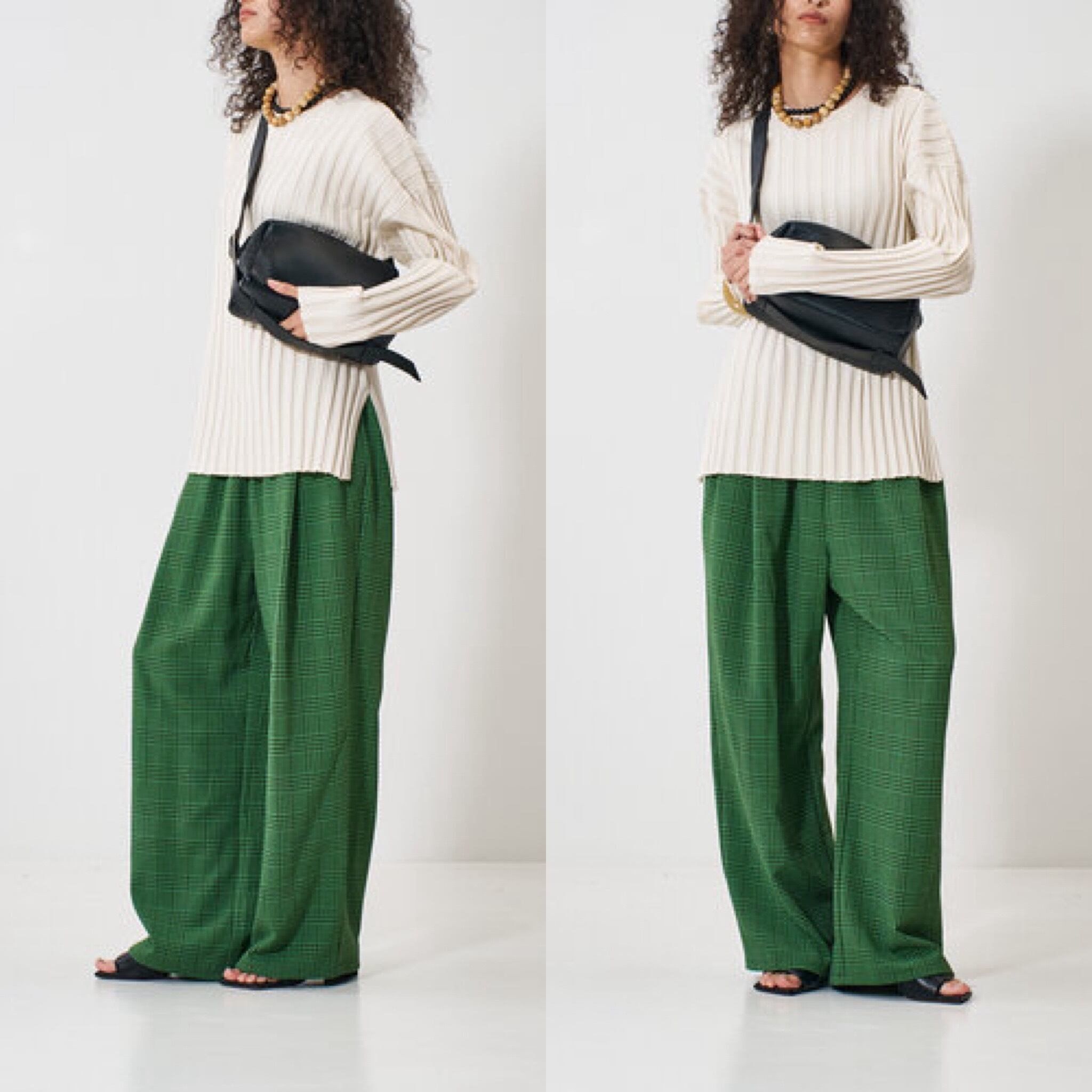 シルエットは2本のタックで作る女性らしらとマニッシュなムードを兼ねた人気のワイドパンツの形を採用。さらっとした肌触りと軽さのある生地はボリュームのあるシルエットでも重くならず、イージーケアなのもうれしいポイントです。 主張しすぎない大人っぽいチェック柄は、程よいアクセントになり、シンプルなトップスとも合わせやすい1枚です。