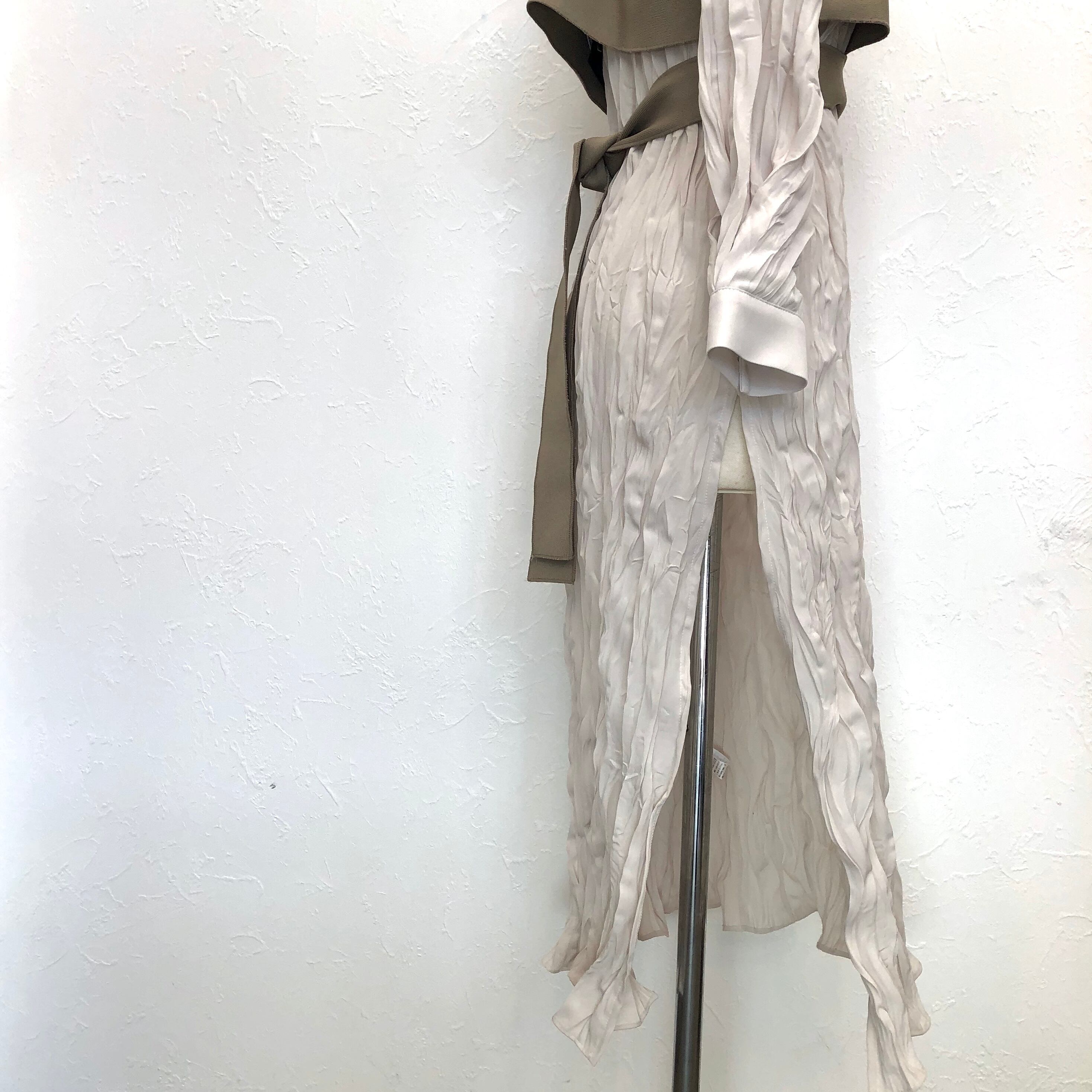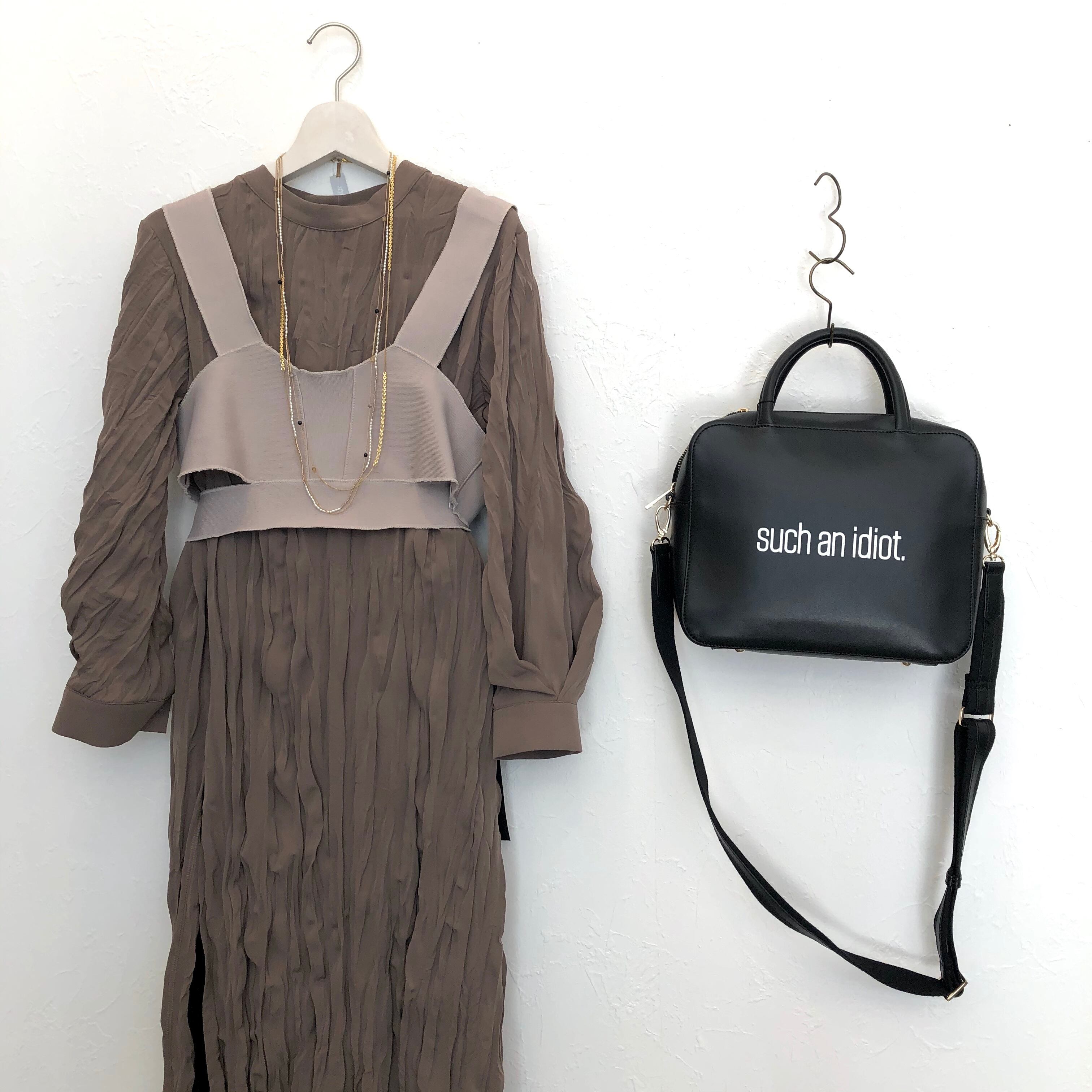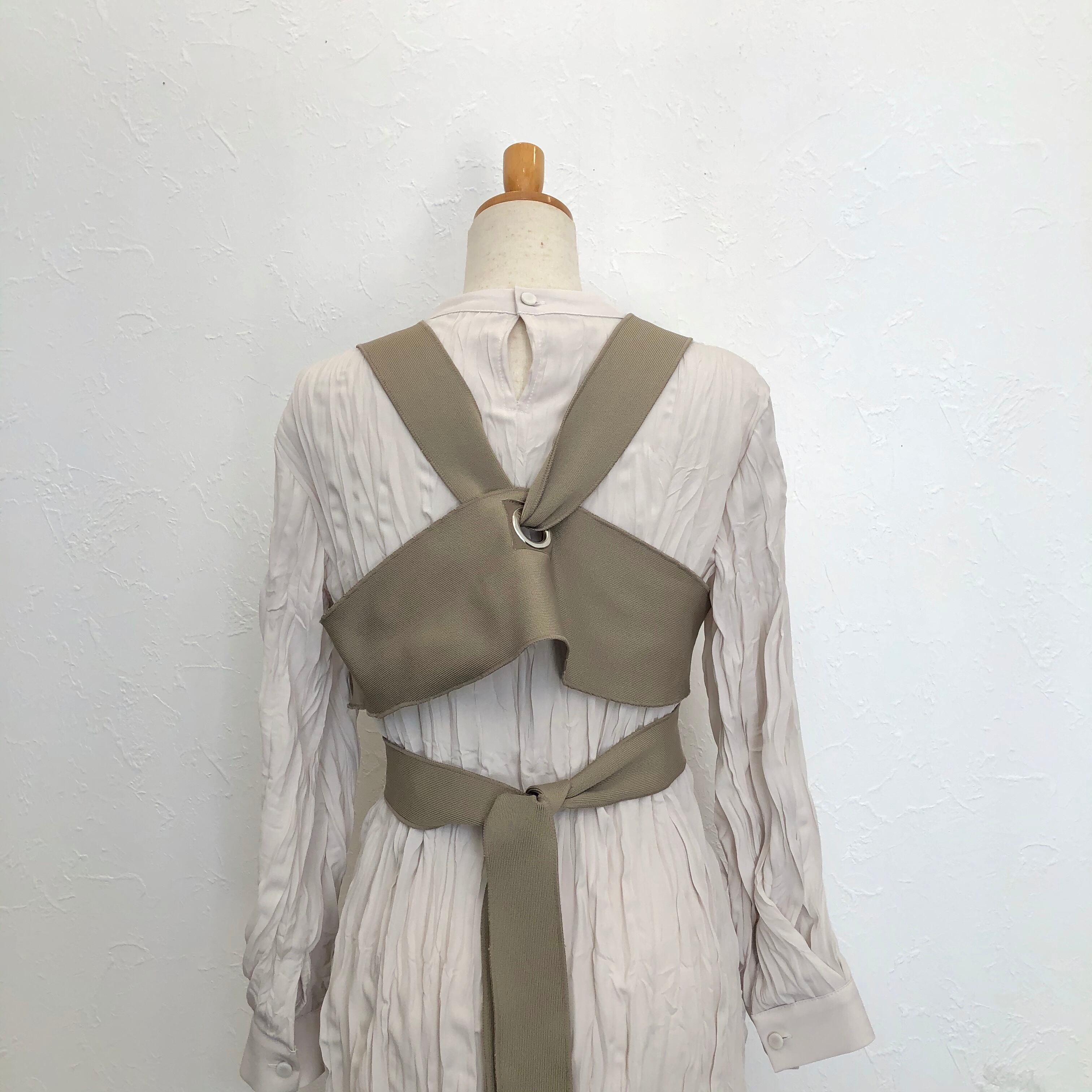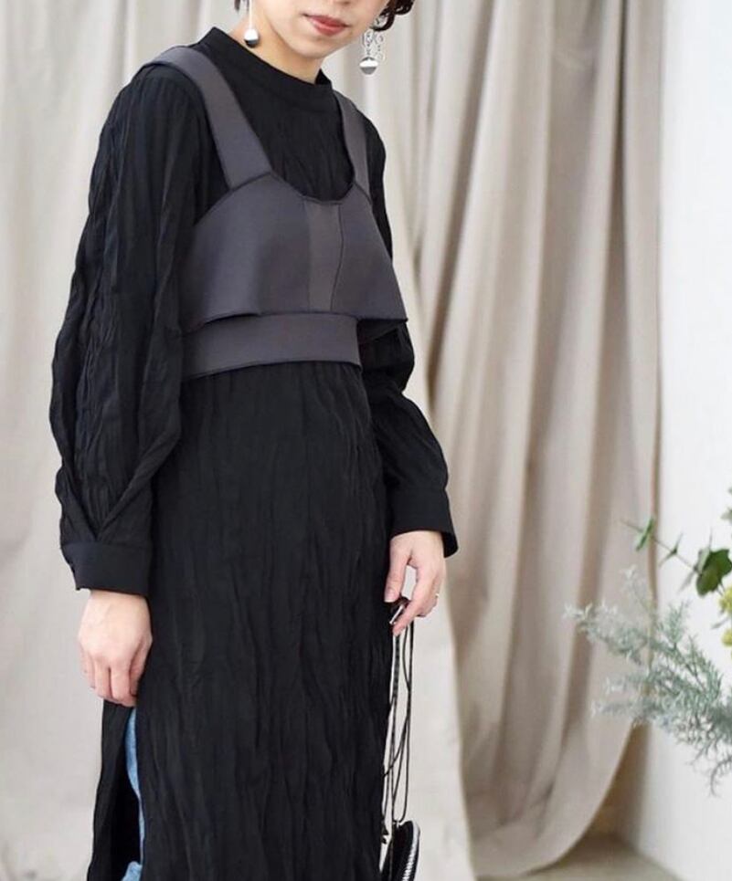 polyesterにポリウレタンの入ったシャリっとしていて取り扱いのしやすい、ワッシャーワンピースとリブビスチェのセットワンピース。