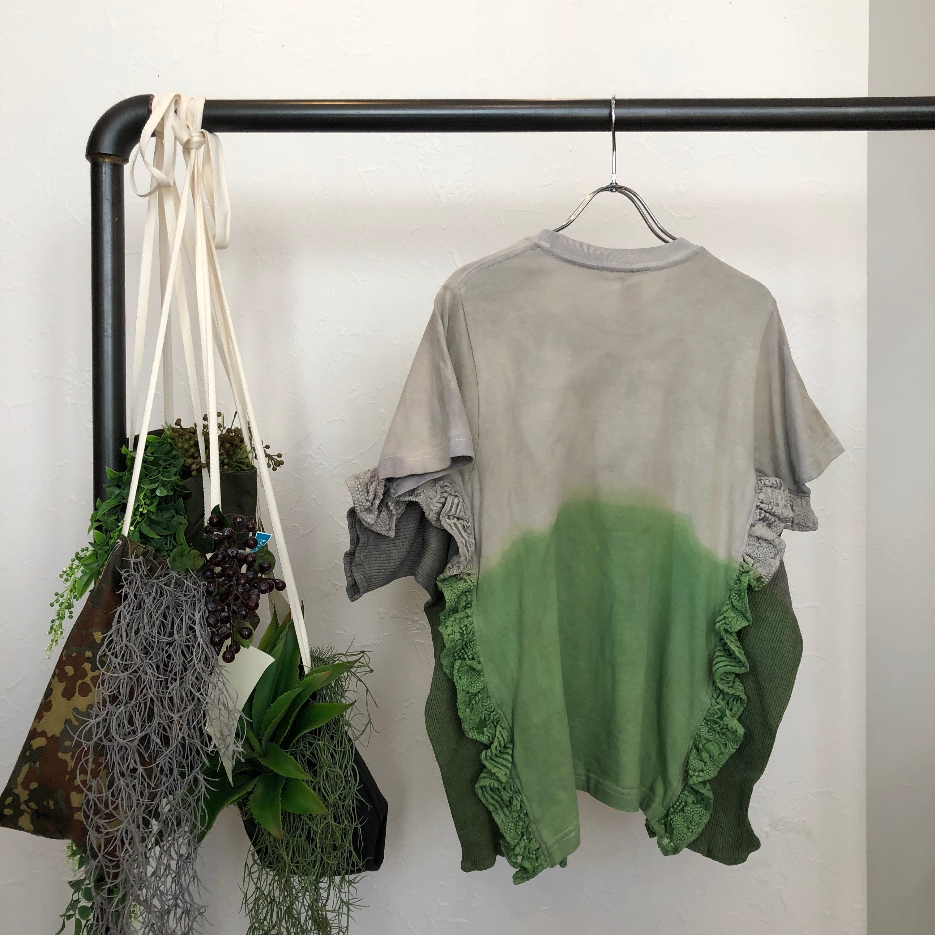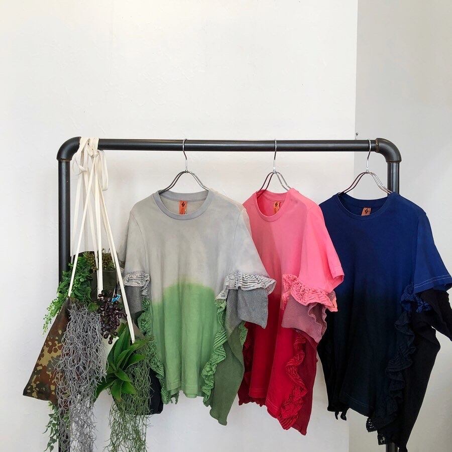 段々とグラデーションに染めているフリルプルオーバー。