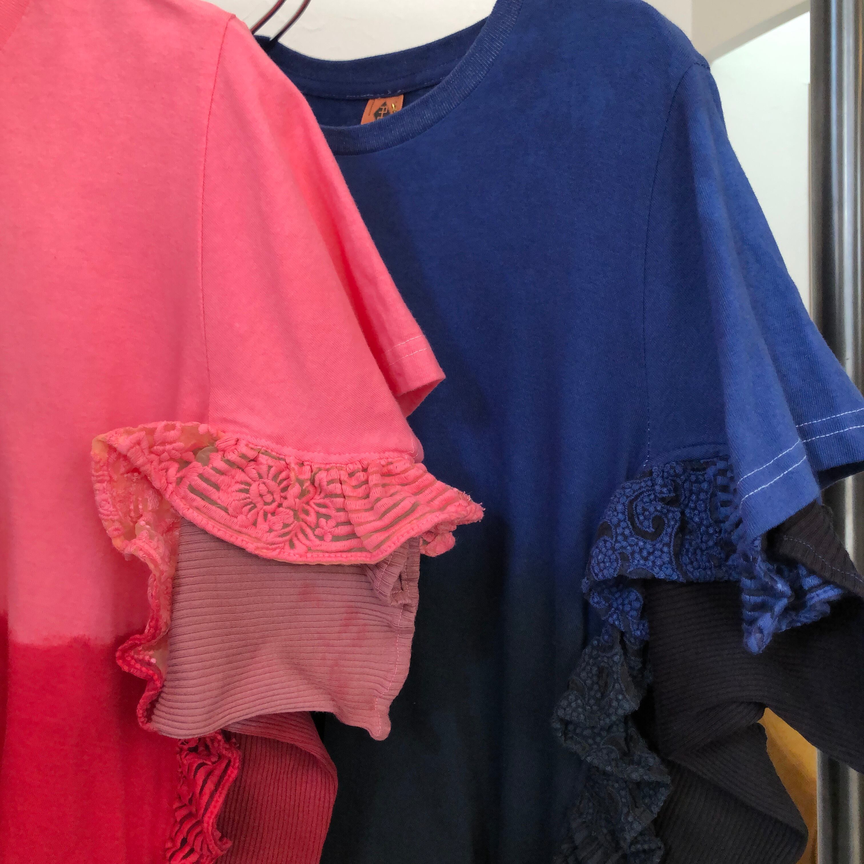 挟んでいるフリルはナイロンのオーガンジーにコットン刺繍を施しているレース達です。