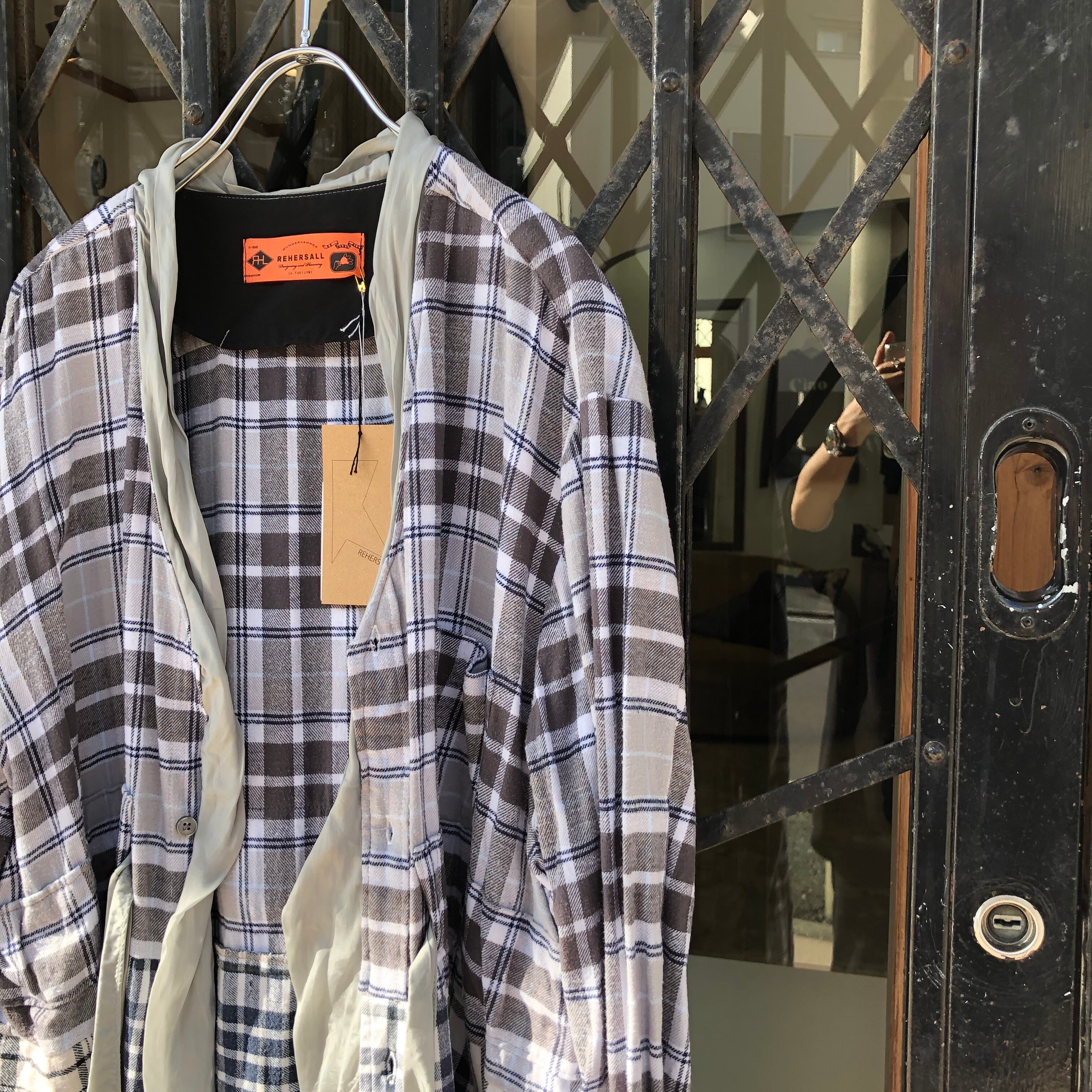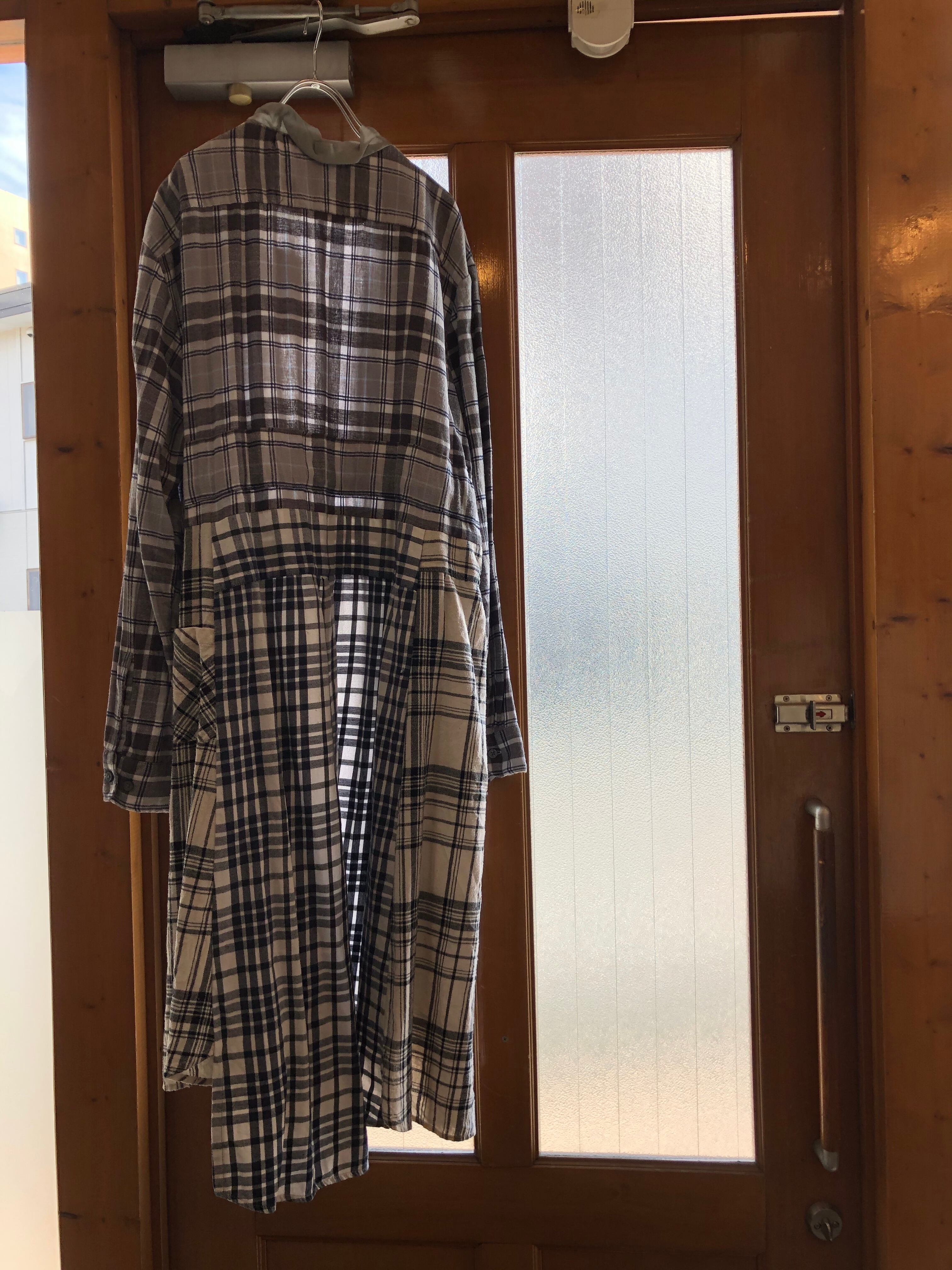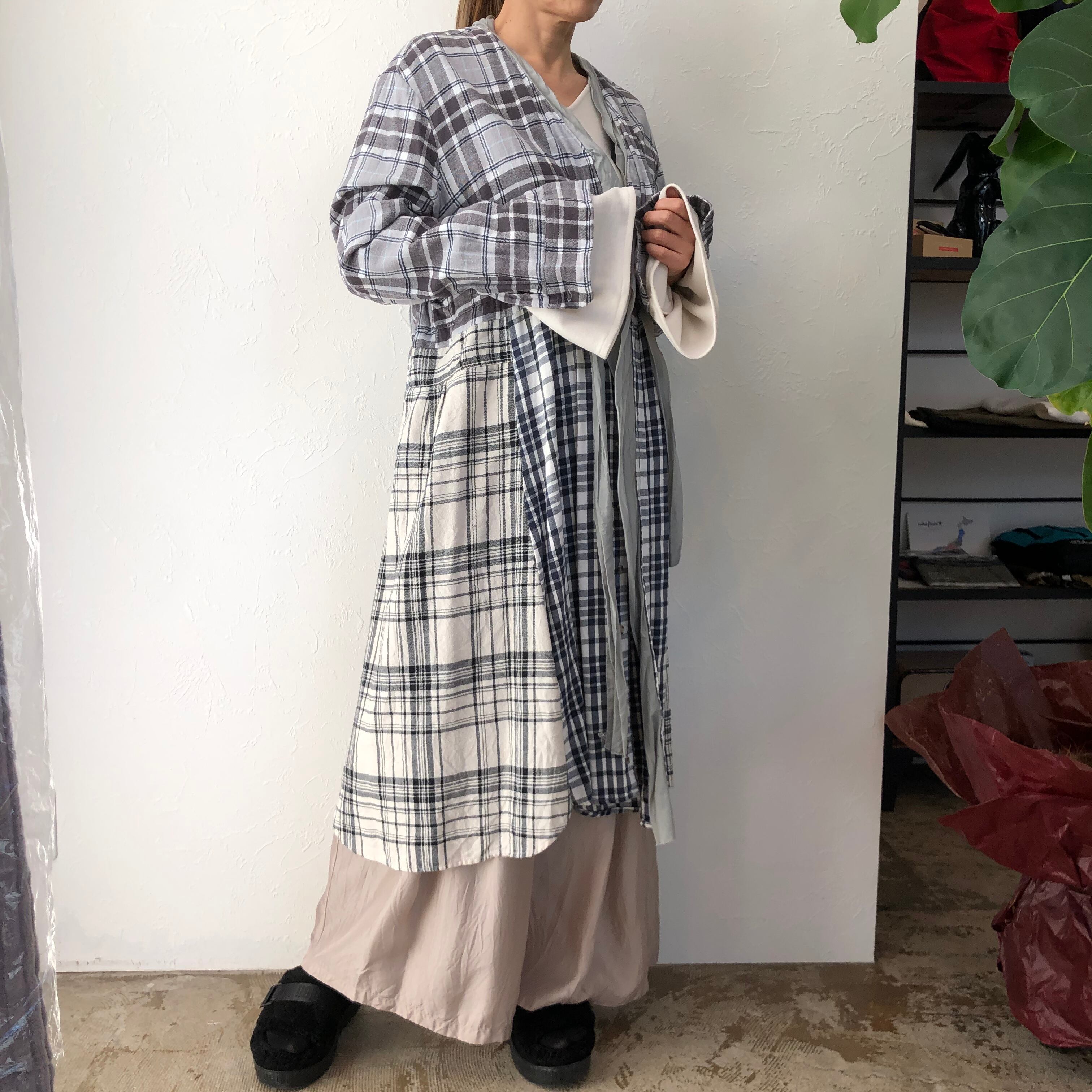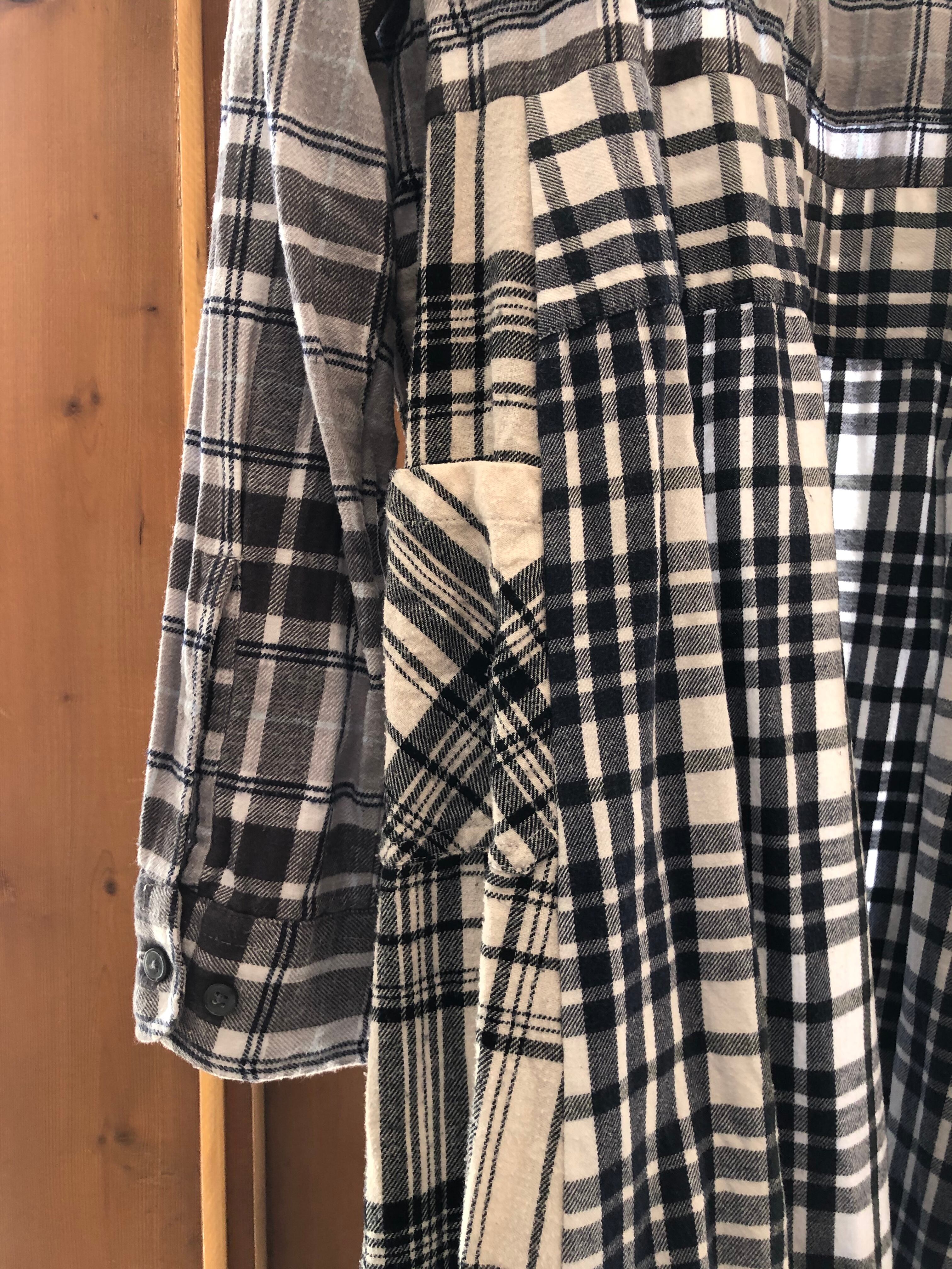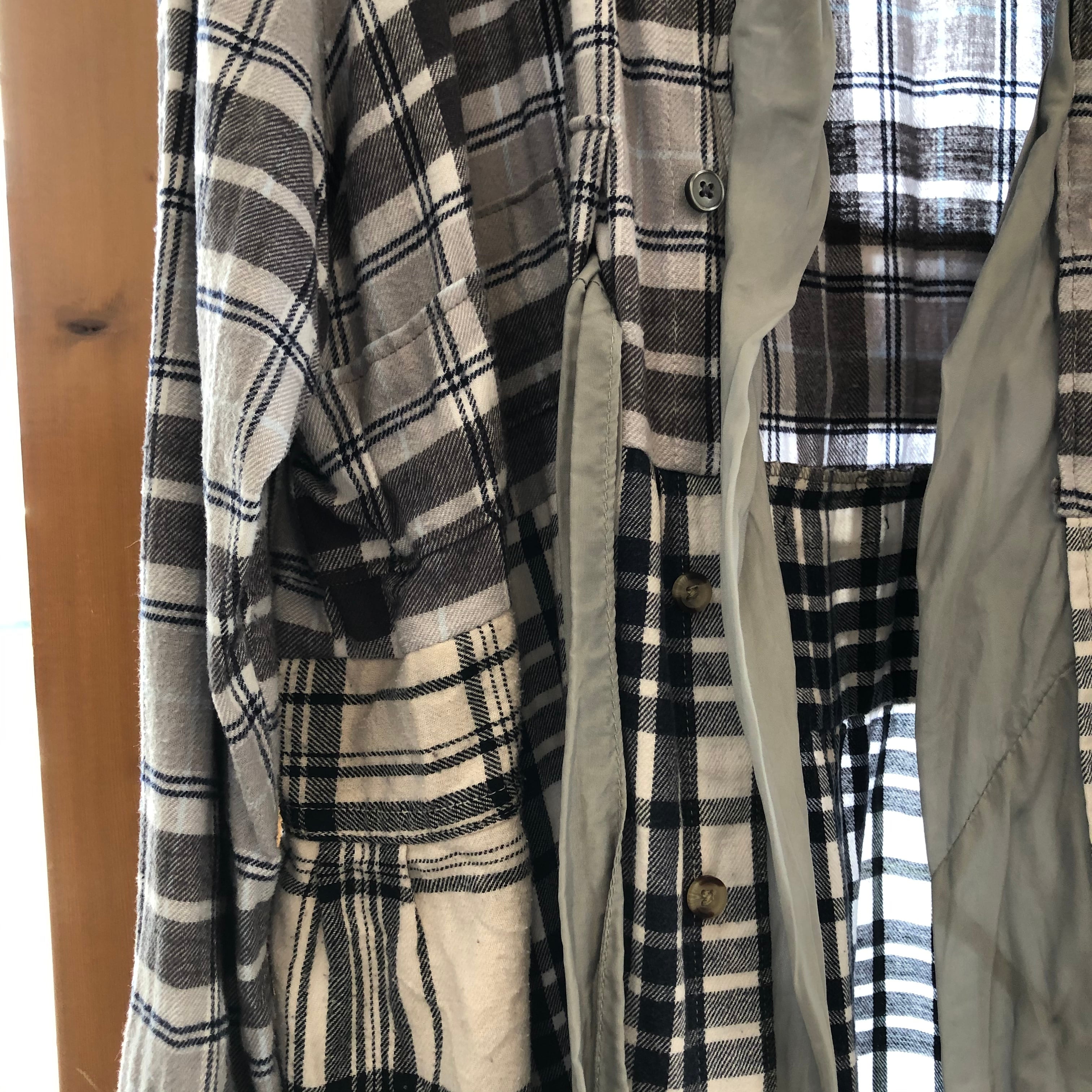 ユーズドのチェックネルシャツをパッチワークした一点物ガウン。