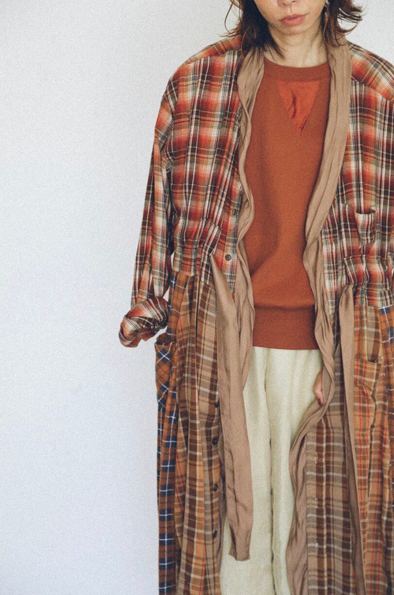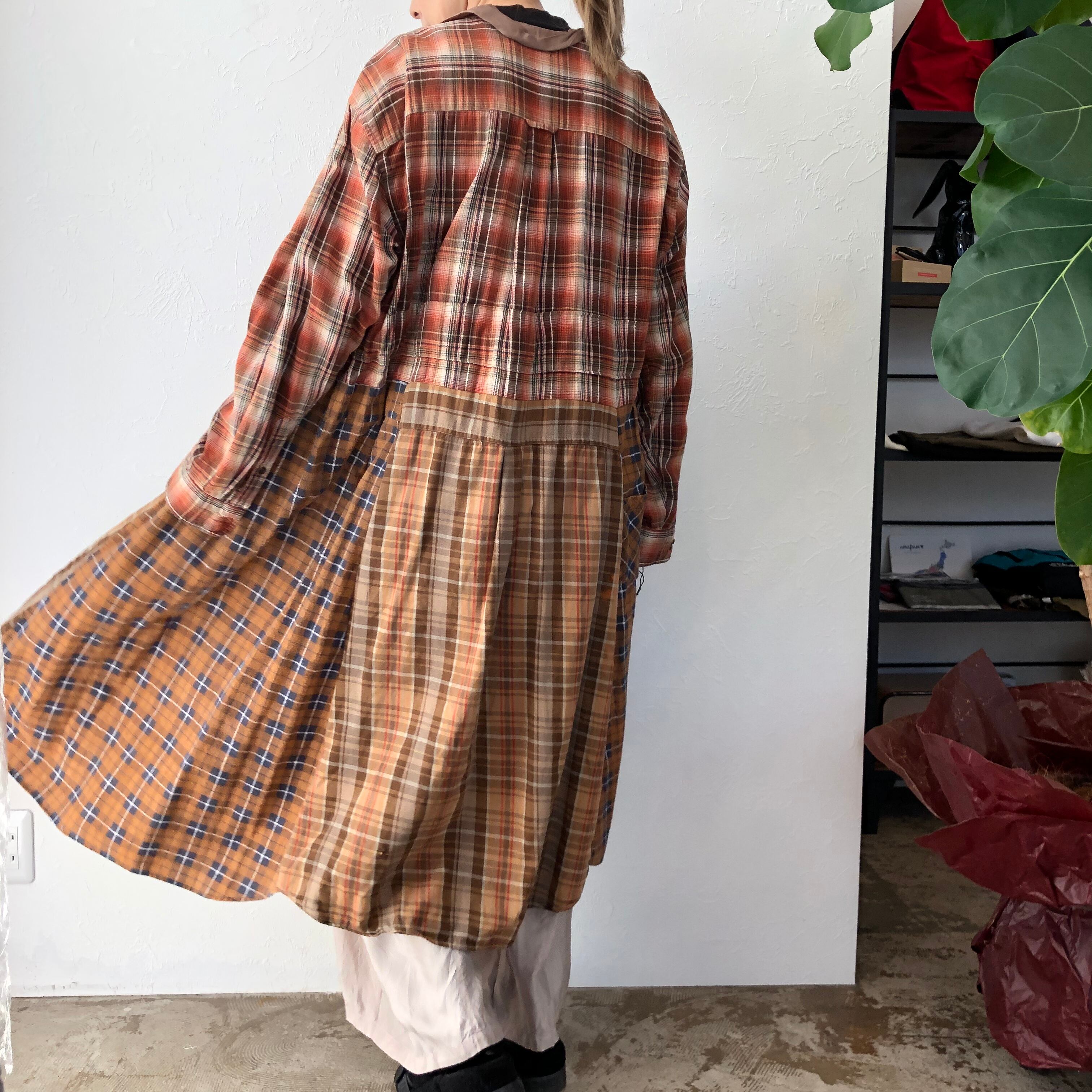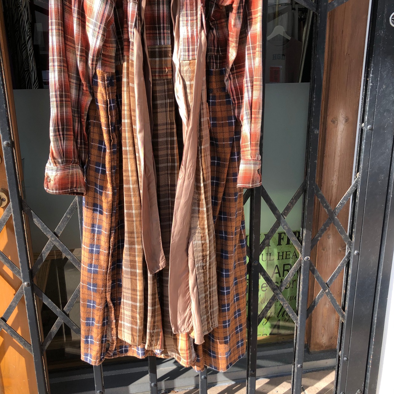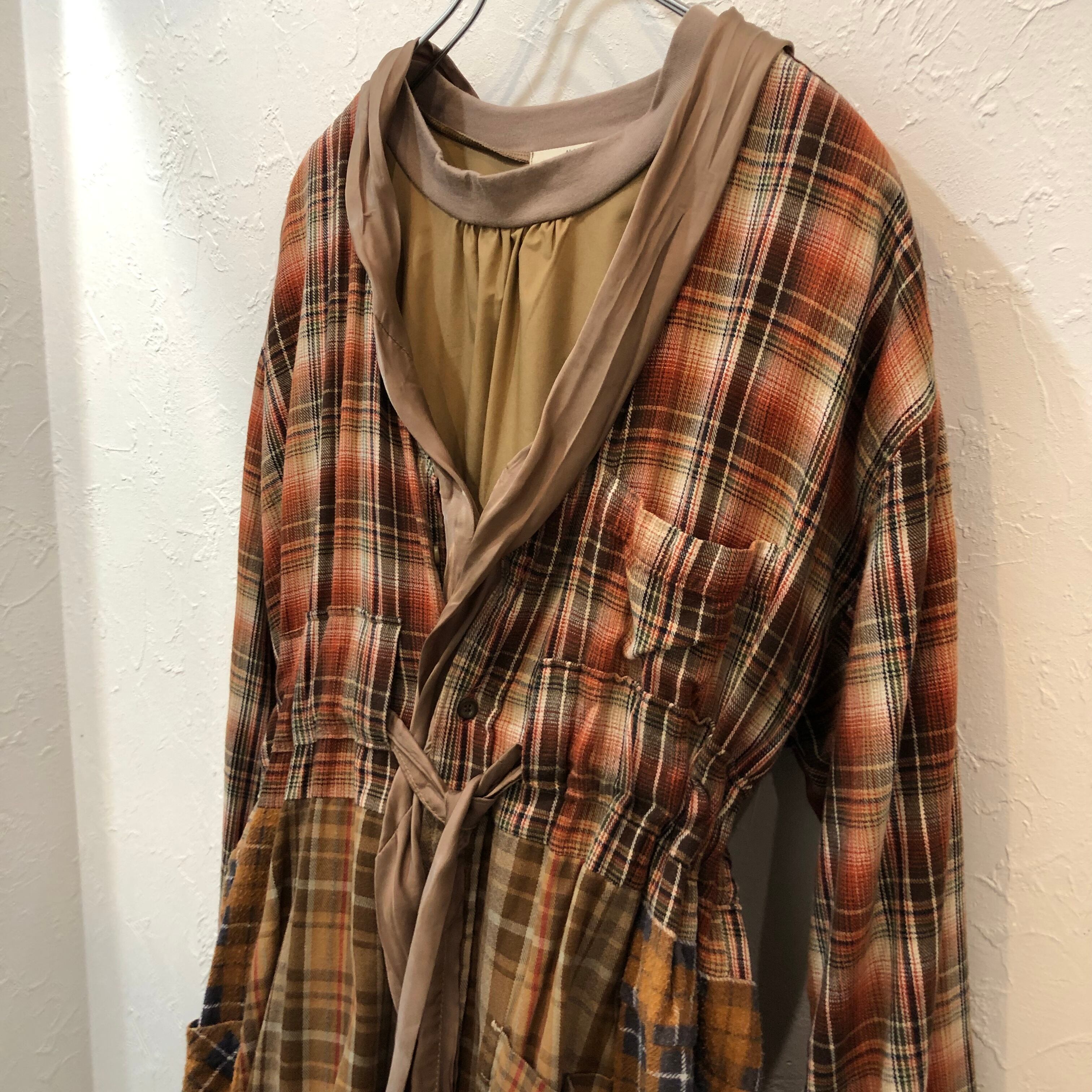 リハーズオールよりユーズドのチェックネルシャツをパッチワークした一点物のガウン。