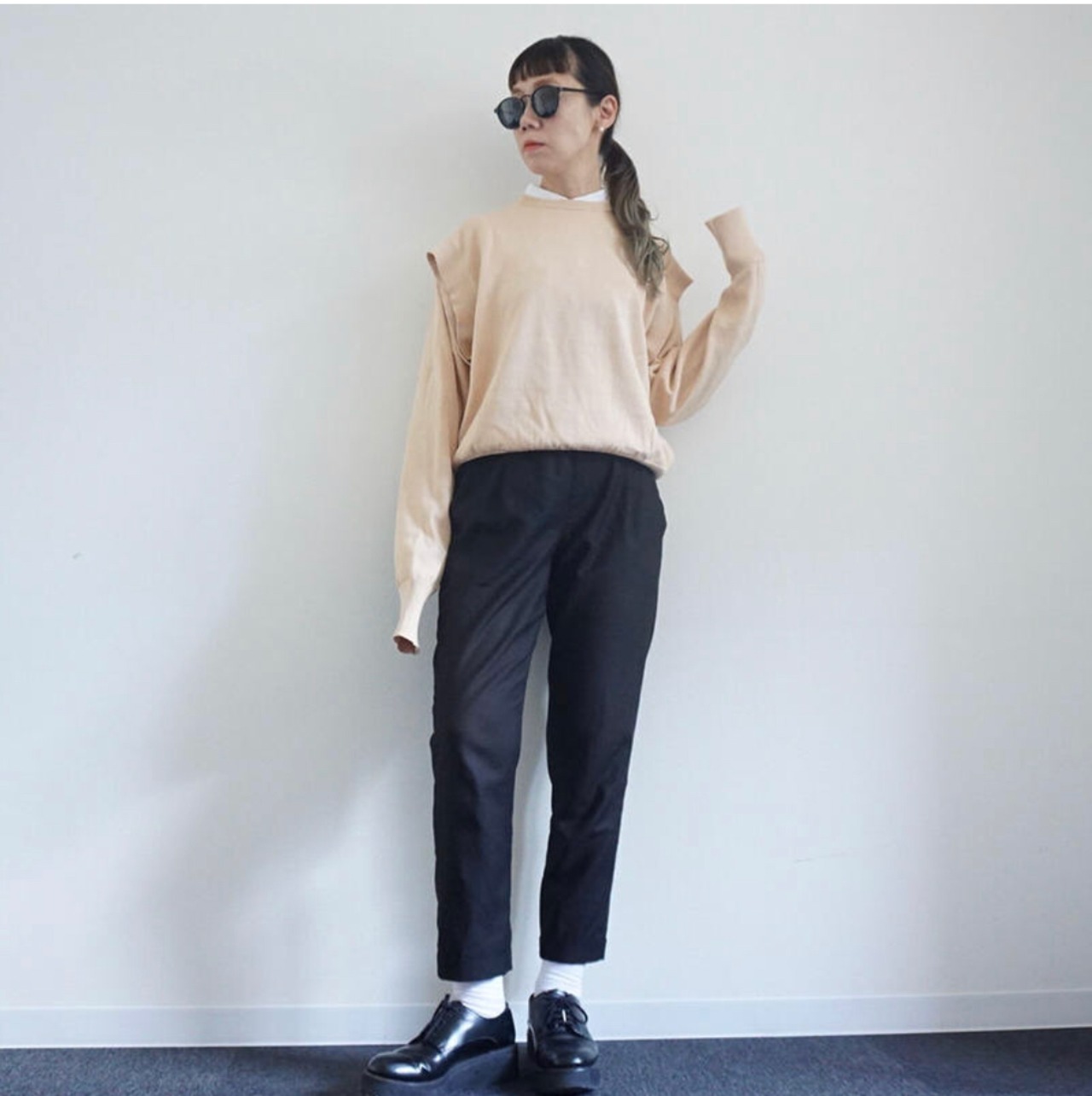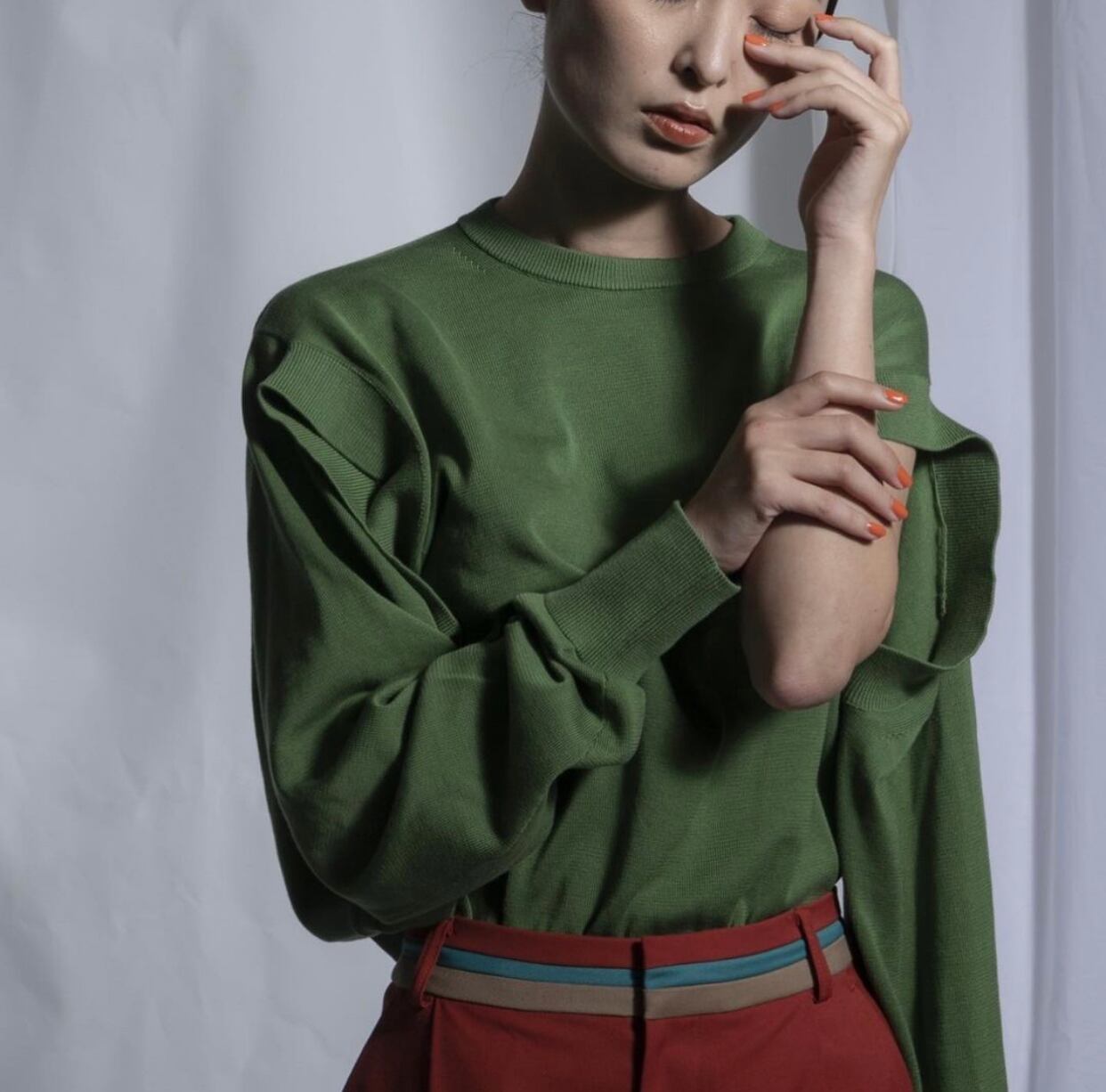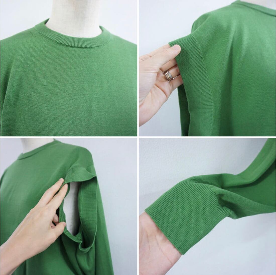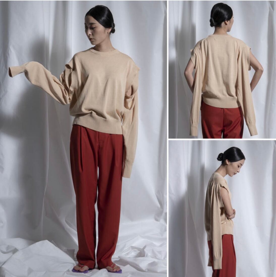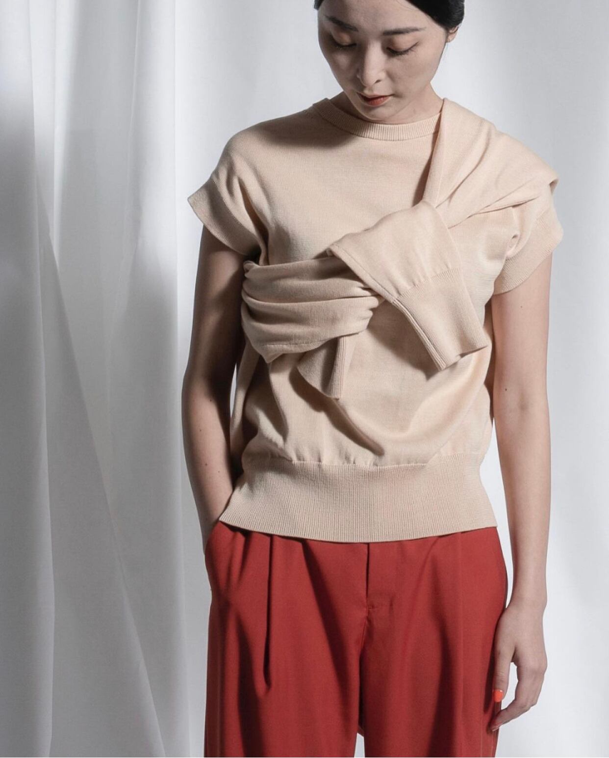 このニットは、肩下部分にもフレンチスリーブになる様な袖穴が付いています。長袖としても、半袖としても両方で着る事が出来ます。また下着などが見えてしまう事もなく、着用時にインナー等に気を使う必要もありません。また身頃は大きめ、袖は長めで、着丈は短めにしました。着る方の体型は選ばず、長めの袖がよりモード感を強くしています。