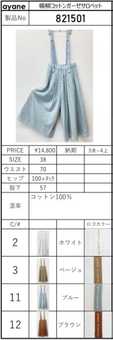 【ayane】楊柳コットンガーゼサロペット(821501)