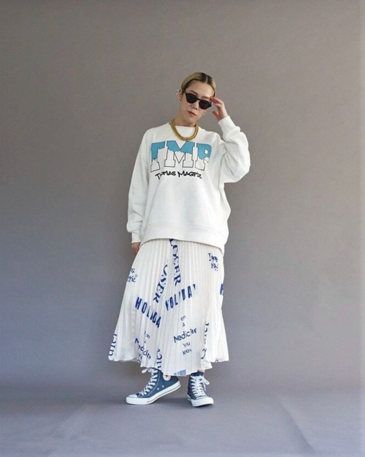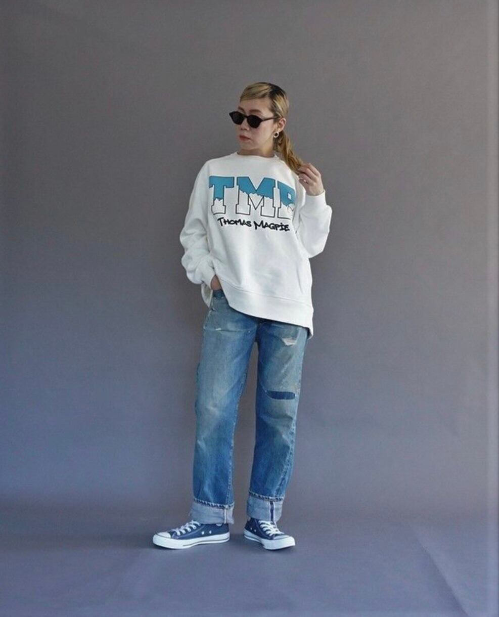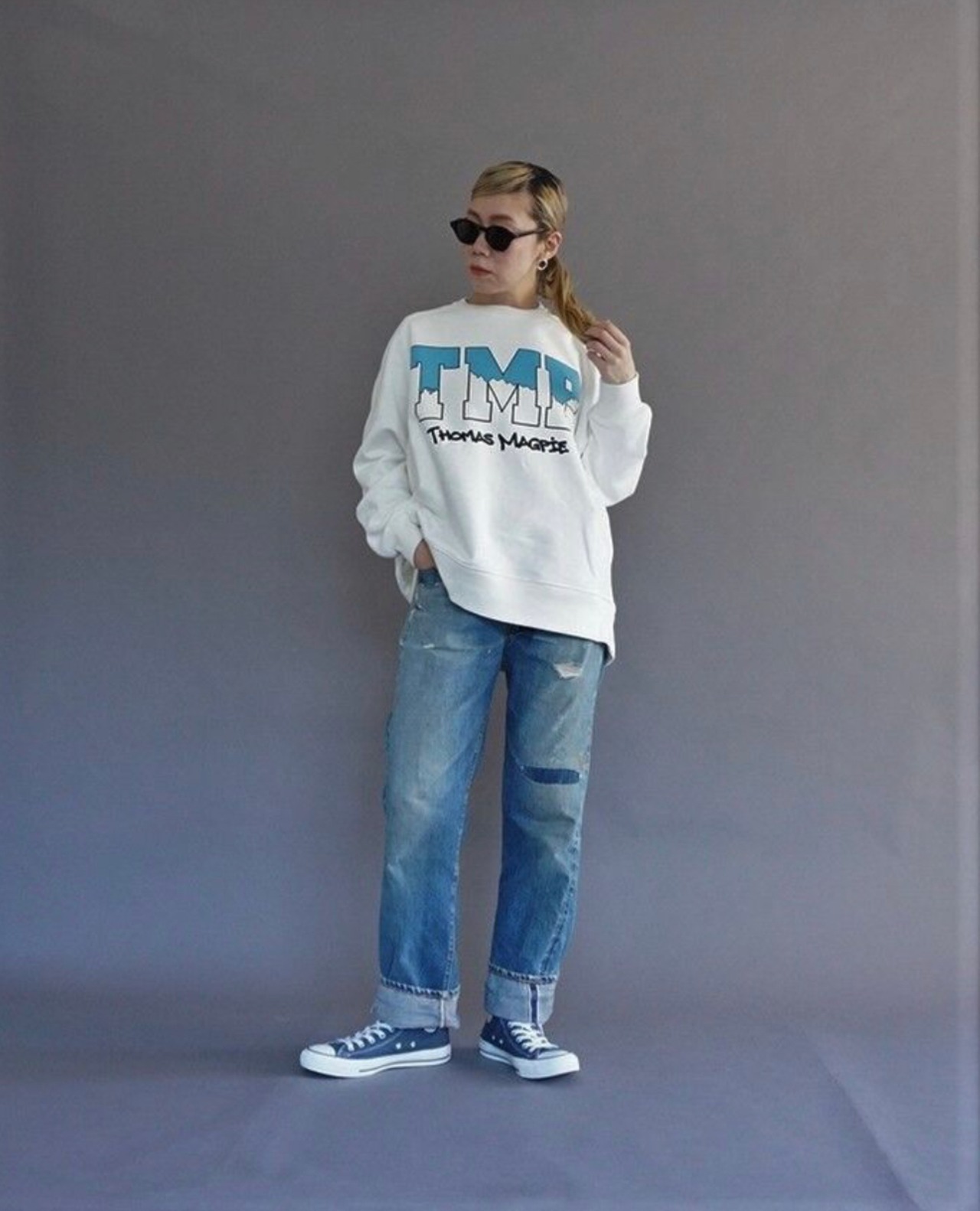 少しナードな雰囲気のあるホワイトのスウェットですが、次の冬には中にシャツを入れて、80年代風にきて欲しいなと思っています。