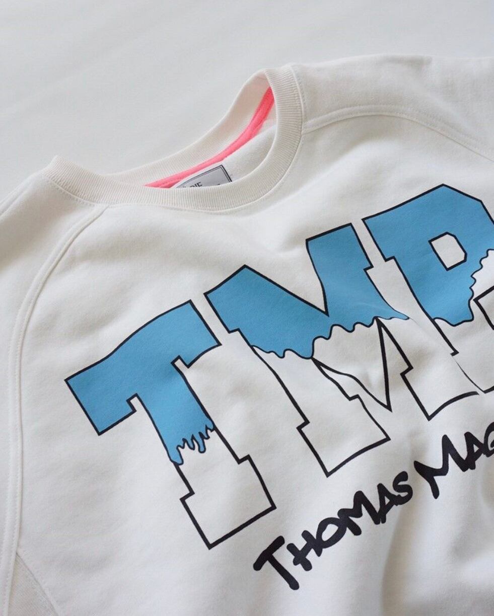 今回は、プルオーバー のクルーネックのスウェットに必須のカラーで欲しいと感じているホワイトボディにTMP(thomas magpie)のロゴを載せました。