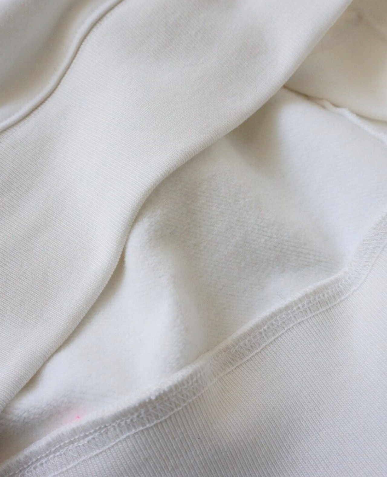 古着などで探したいと思うと、腰回りの開き、サイズ感がイマイチしっくり来なかったりします。女性にとって、スウェットの腰回りのタイトさは着丈が長いほどムチムチしていないか、気になりがちではないかと思います。このスウェットは、腰周りをやや大きめにしていて、なるべくタイトにならないようにデザインをしました。腰周りからヒップ周辺にかけ、体からやや離れるパターンにしているため、腰周りが気になる方もストレスなく着れる、と以前から大変好評なサイズ感です。