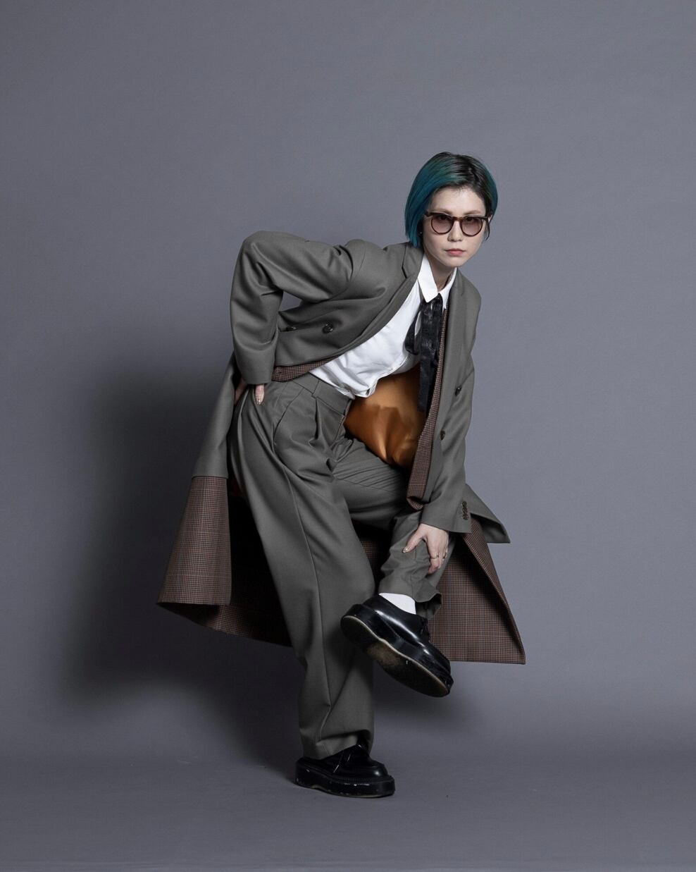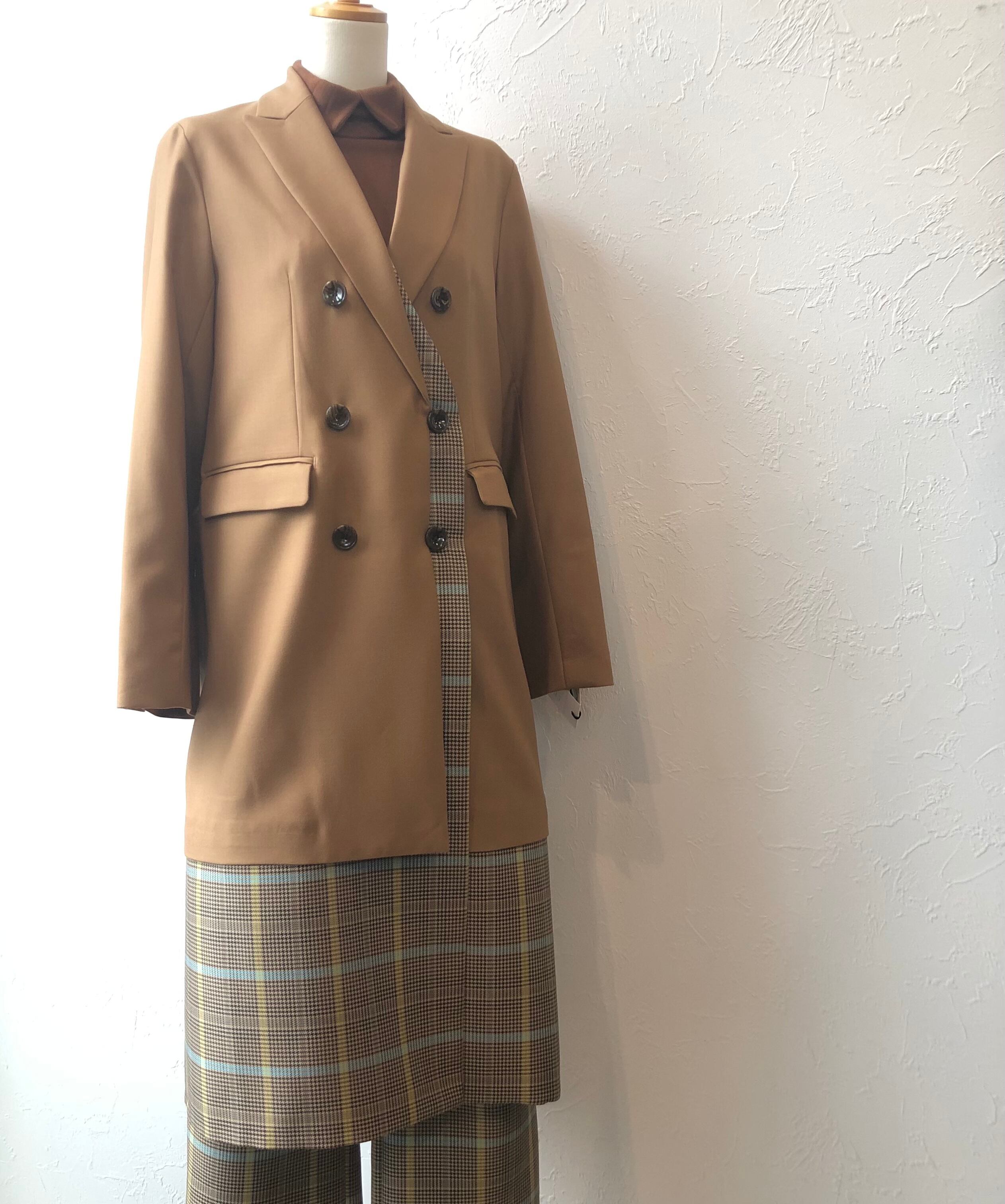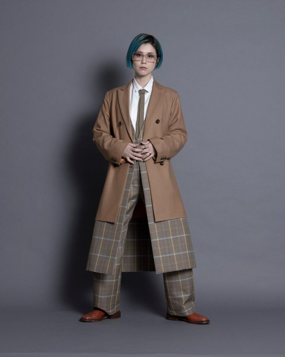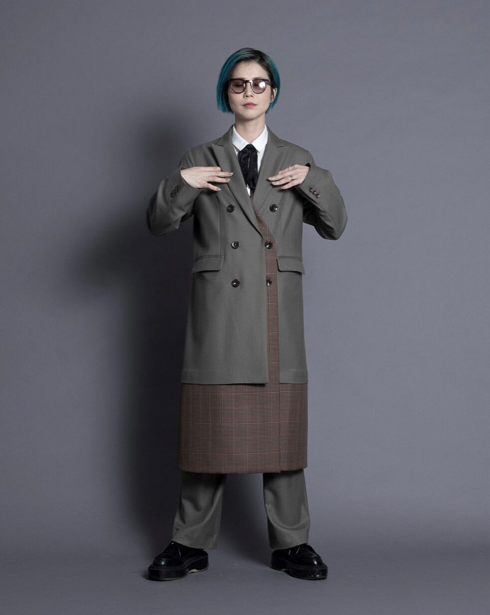 毎回人気が出ているアレンジを加えるテーラードをデザインするのが最近はプレッシャーになってきました。重ね着をした際に思いついたデザインで、チェックのコートの上に長めのジャケットを重ねたかのようなデザインにしました。