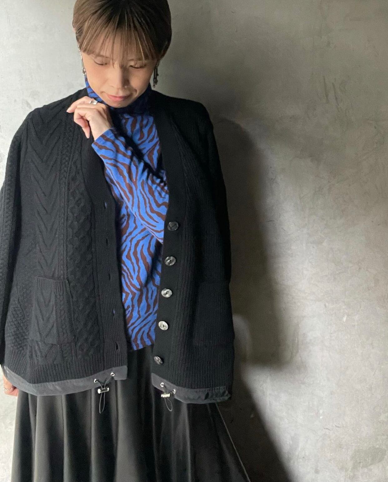 コーディネートのゼブラタートルネックトップス(3色10月下旬)・ドロストケーブルカーディガン(販売中)もご一緒に購入ご希望の方はお気軽にお問い合わせください。