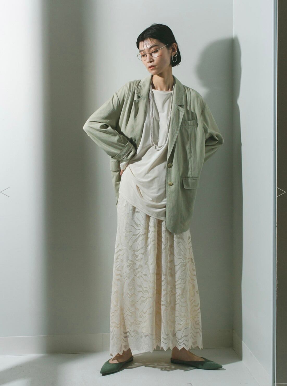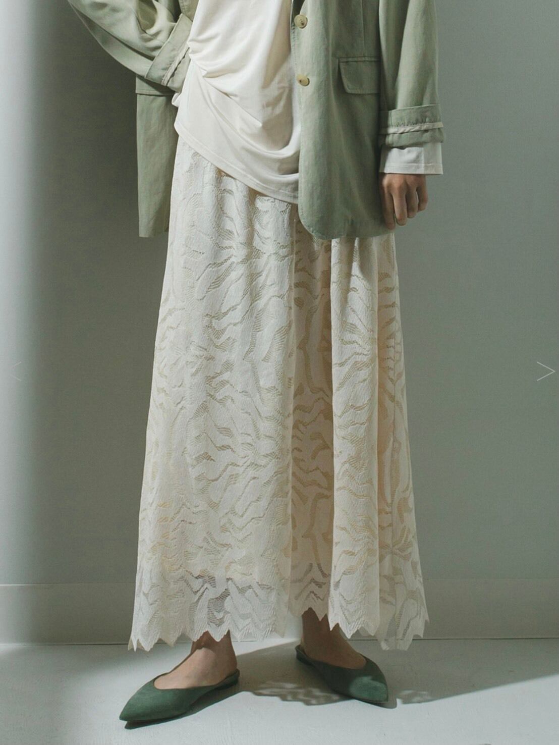裾のスカラップもポイントになり、裾にかけて緩やかに広がるシルエットは、ボリュームのあるトップスと合わせた時も相性抜群です。