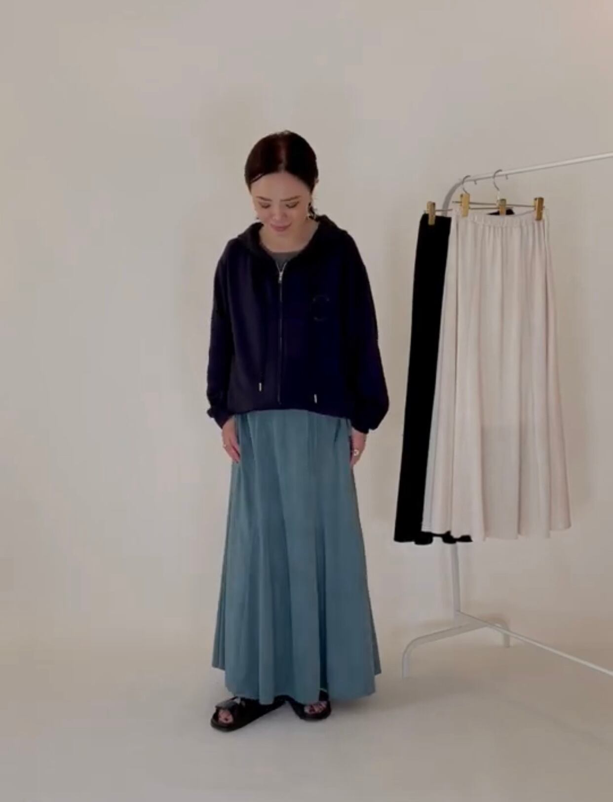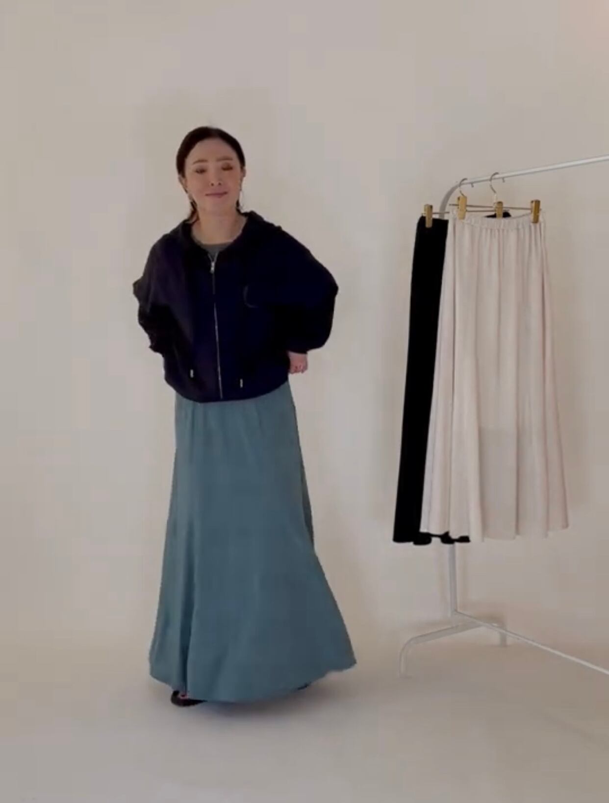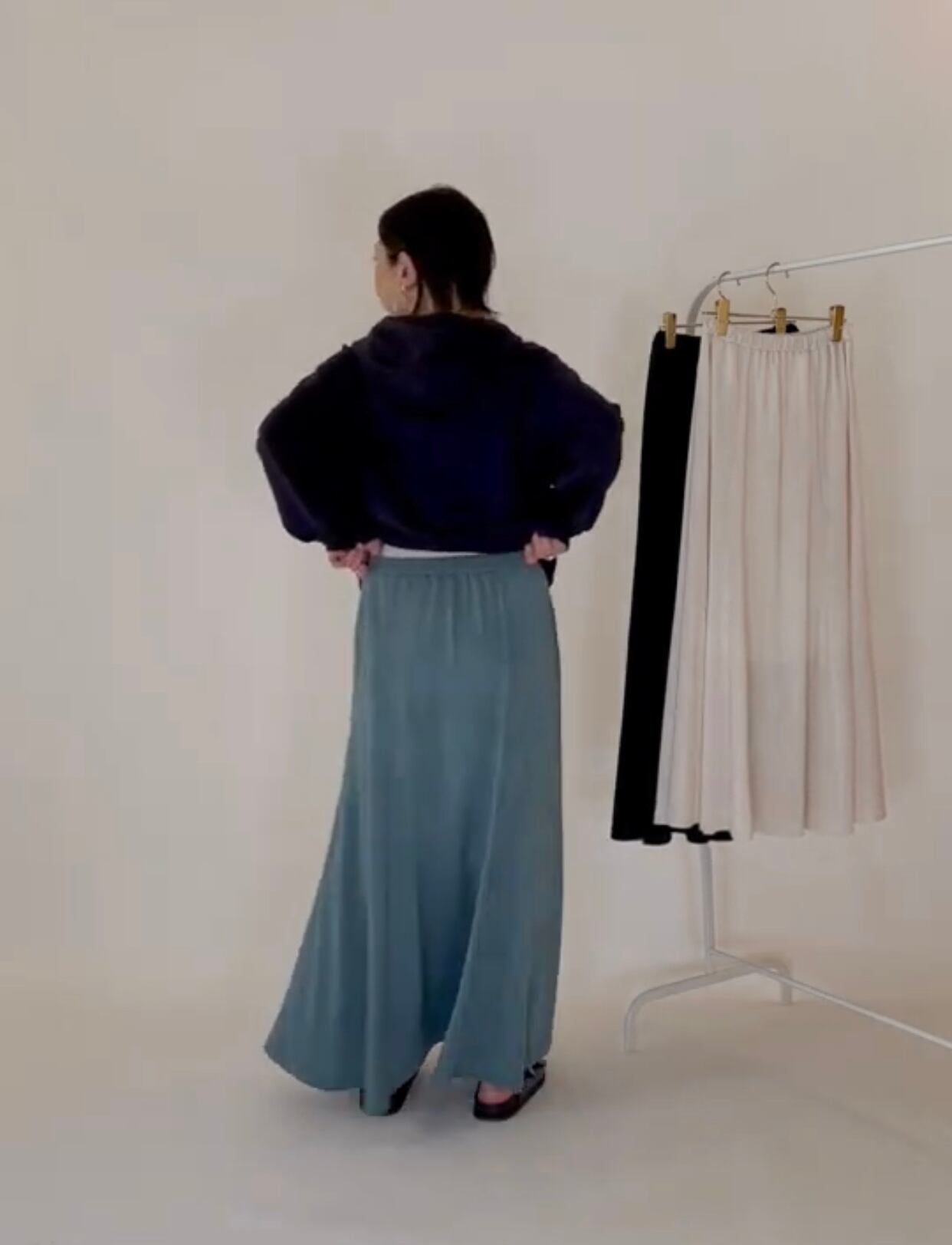 ツヤのあるポリエステルジャージーがスポーティーな印象の、マキシスカートです。
