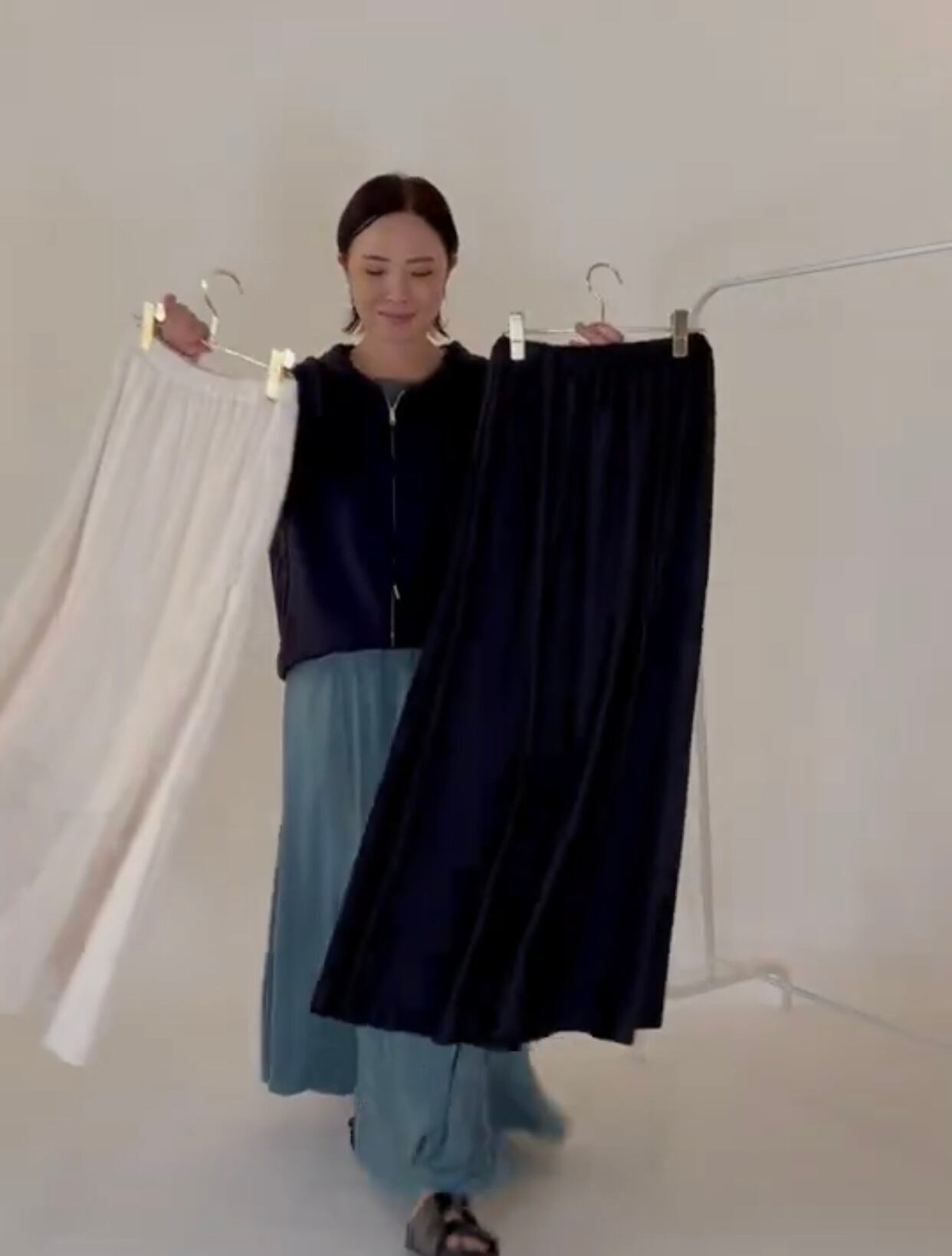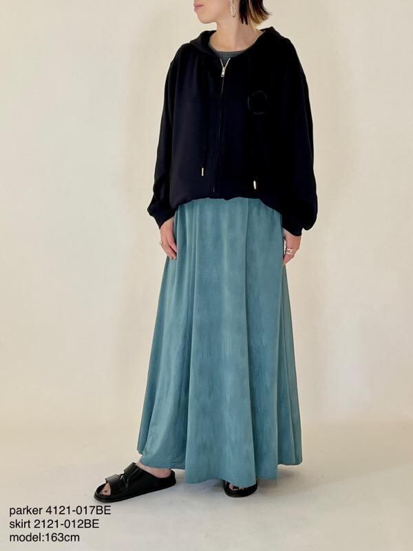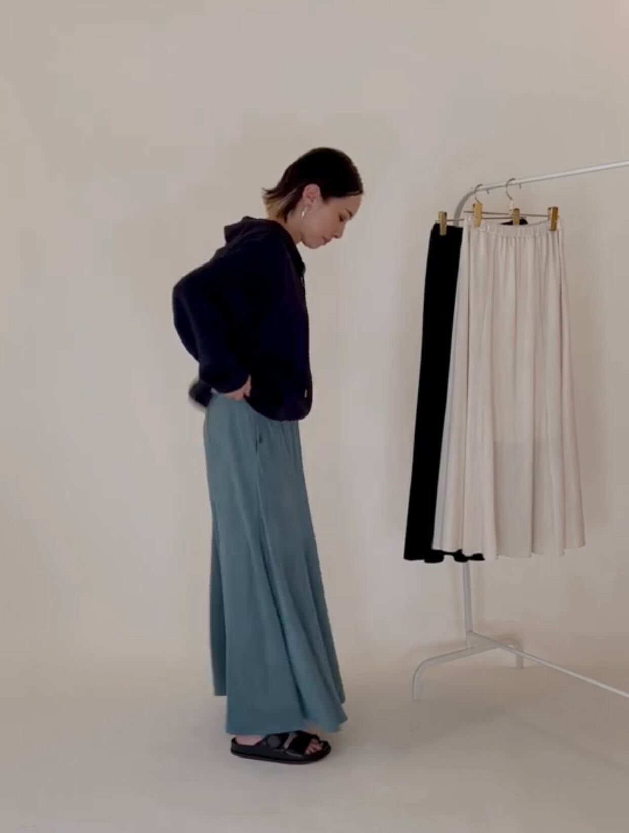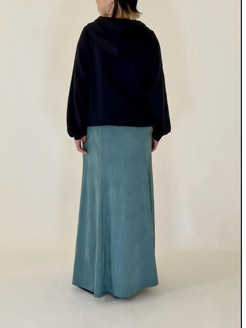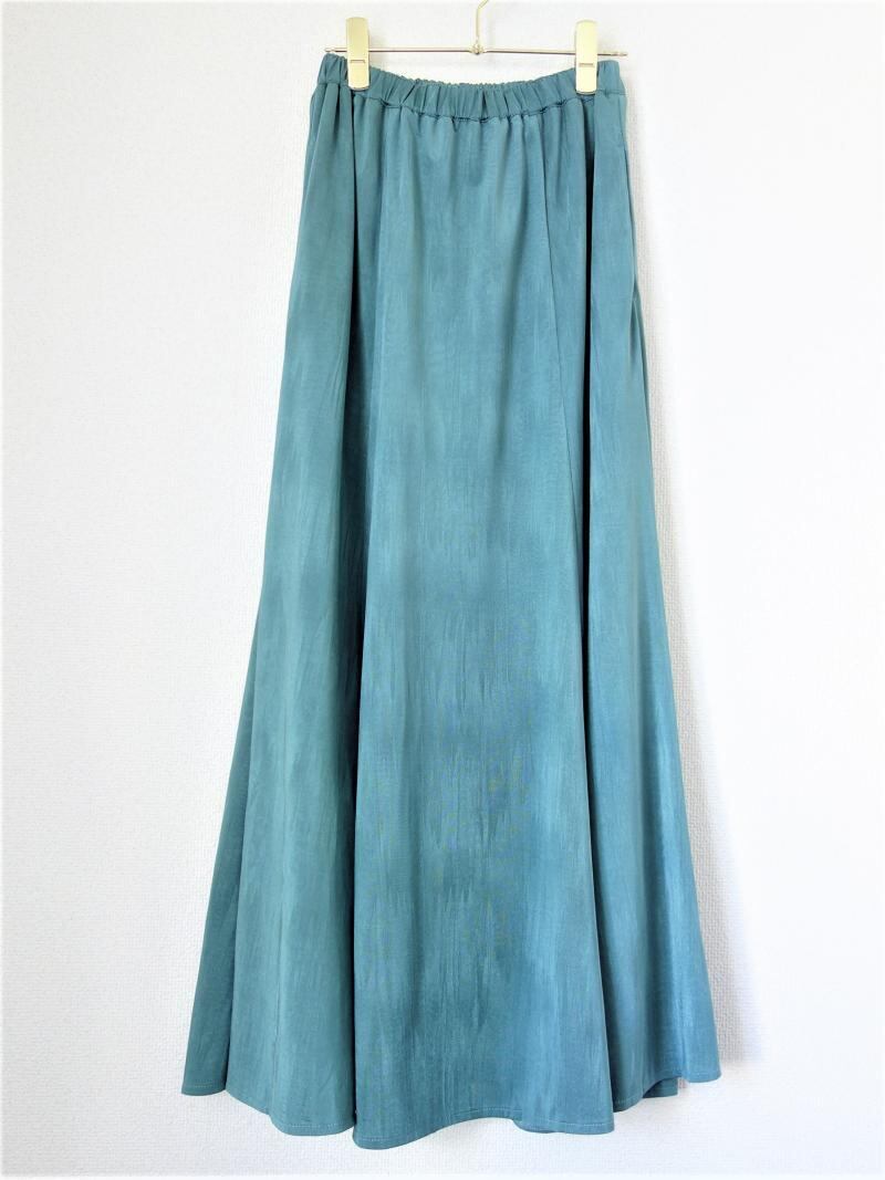 切替を利用したフレア展開で腰回りはすっきりと、膝上から裾にかけてボリュームを出して、マーメイド風のシルエットになっています。